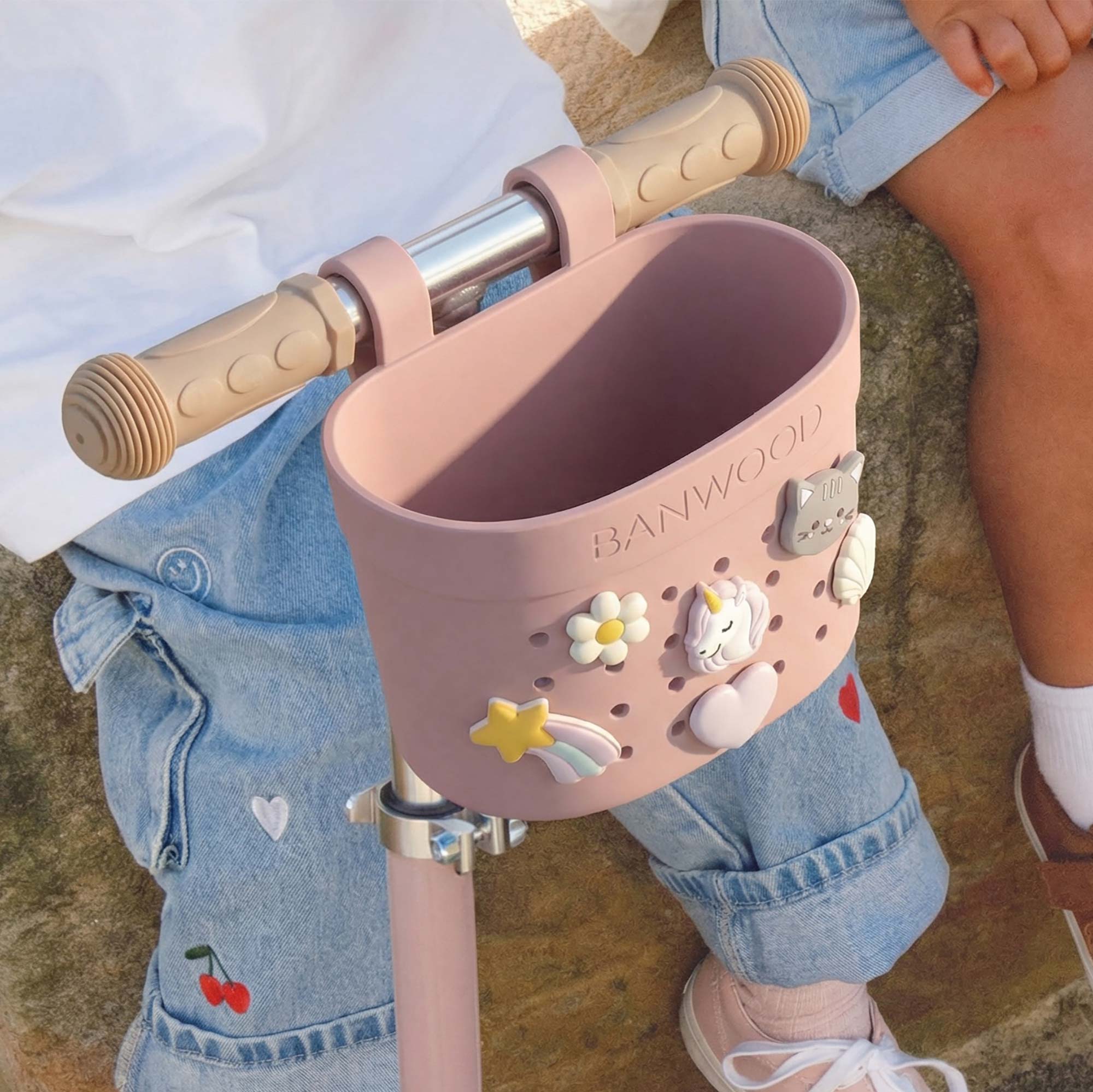 Víziou Banwood je pozitívne ovplyvňovať aktívny životný štýl detí od útleho veku. Banwood ponúka štýlové produkty v nadčasovom minimalistickom dizajne a vysokej kvalite, ktoré pomáhajú rozvíjať osobnosť detí a vytvárať spomienky na detstvo plné radosti. Milujeme spôsob, akým sa deti hrajú! Ozdoby na košík Pin & Ride od Banwood sú vyrobené tak, aby každej jazde dodali trochu osobnosti. Dajú sa jednoducho zatlačiť, vybrať a kedykoľvek vymeniť. Deti môžu kombinovať ozdoby, kým nenájdu kombináciu, ktorá sa im páči. Sú vyrobené z odolných materiálov, navrhnuté na každodenné používanie, jednoducho sa používajú a prinášajú radosť znova a znova. Vyrobené z recyklovanej, odolnej gumy. Flowers: Inšpirované jemnými tvarmi kvetov 70. rokov. Malá zmes kvetov na rozjasnenie košíka. Dinosaurus: Dinosaury pripravené vyraziť na jazdu. Pre najmenších, ktorí majú radi trochu dobrodružstva. Space: Rakety, hviezdy a malí prieskumníci. Pre jazdy plné veľkých nápadov. Magic: Jednorožce, dúhy a malé dotyky mágie. Extra zázraky do každodenných jázd.