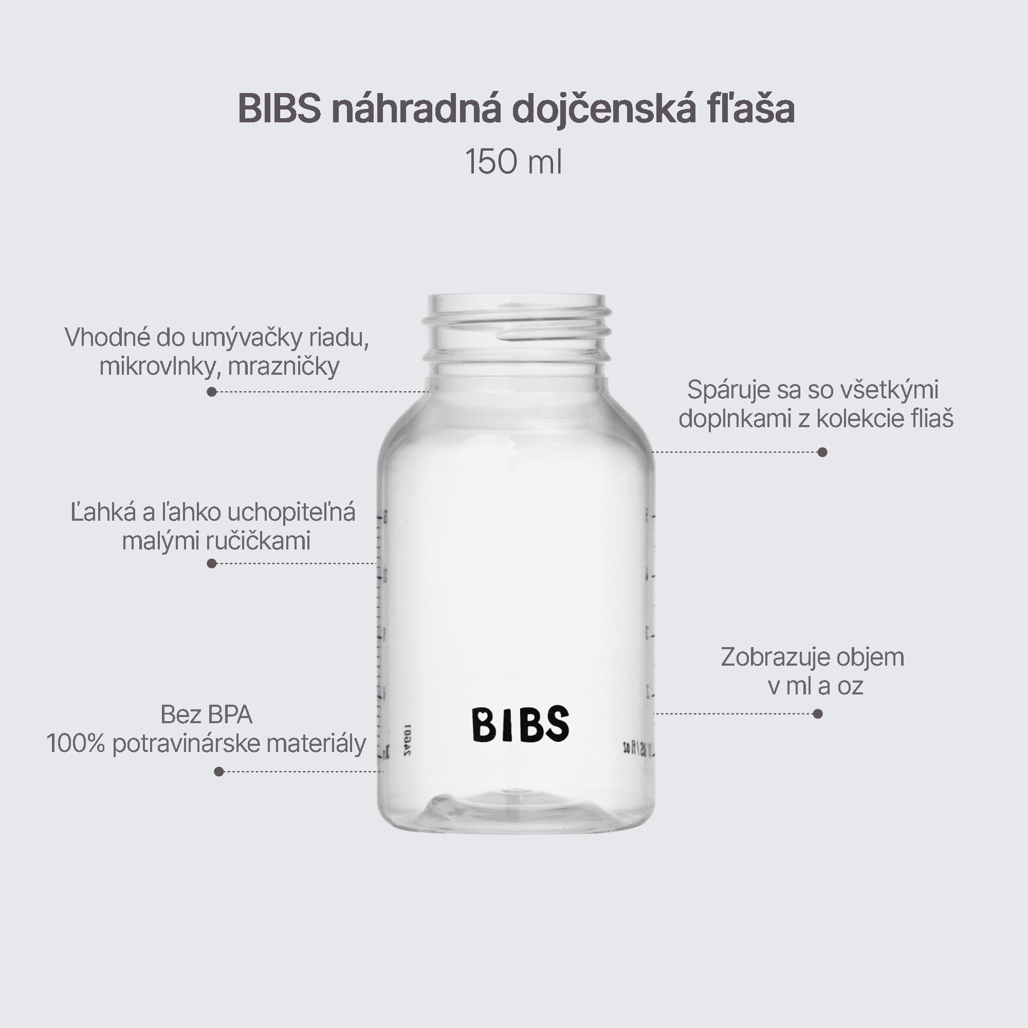 Toto je len náhradná fľaša. Všetky ostatné diely je potrebné zakúpiť samostatne. BIBS je obľúbená dánska značka s tradíciou výroby ikonických cumlíkov od roku 1978. Okrem cumlíkov BIBS ponúka aj pestrý prémiový sortiment pre najmenšie deti v minimalistickom škandinávskom dizajne a širokej farebnej palete. Rodiny si zaslúžia detskú fľašu bez kompromisov v oblasti pohodlia, bezpečnosti ale aj dizajnu. Zoznámte sa s antikolikovou dojčenskou fľašou BIBS, obľúbenou pre svoj elegantný dizajn s ocenením Red Dot Design Award. Plastová fľaša z potravinárskeho PP bez obsahu BPA a ftalátov – 150ml alebo 270ml. Vhodná do umývačky (horný kôš), mrazničky aj mikrovlnky. 100% recyklovateľné. OBSAH BALENIA: Samostatná plastová fľaša 150 ml bez cumlíka, uzáverov a doplnkov. MIX&MATCH: Ku fľaši si môžete dokúpiť kaučukový alebo silikónový cumlík s rôznym prietokom (pomalý, stredný, rýchly) ako aj set uzáverov (objímka, vrchnák a tesniaci disk) v rôznych farbách. Nakombinujte si fľašu podľa potrieb dieťatka a vašich preferencií. Alebo si môžete zakúpiť kompletný set BIBS antikolikovej dojčenskej fľaše (150 ml alebo 270 ml), ktorá vám poskytne všetko, čo potrebujete na pohodlné kŕmenie z fľaše (fľaša, cumlík, objímka, vrchnák, tesniaci disk a lievik). POUŽITIE: Pred prvým použitím sterilizujte fľašu vo vriacej vode po dobu 5 minút, neskôr sterilizujte podľa potreby. Telo fľaše môžete umývať v umývačke riadu v hornom koši. BIBS fľaše spĺňajú európsku normu EN 14350:2020.