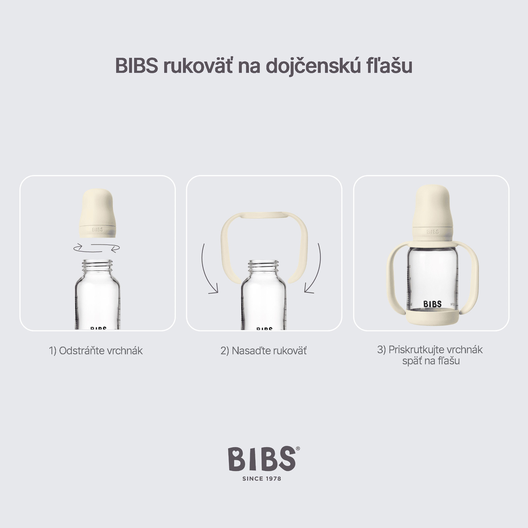 BIBS je obľúbená dánska značka s tradíciou výroby ikonických cumlíkov od roku 1978. Okrem cumlíkov BIBS ponúka aj pestrý prémiový sortiment pre najmenšie deti v minimalistickom škandinávskom dizajne a širokej farebnej palete. Nechajte svoje ratolesti užívať si samostatnosť pri pití. S uškami na fľašu to bude jednoduché. Ergonomický dizajn a protišmykový povrch BIBS ušiek na fľašu uľahčuje uchopenie malými rúčkami. Rukoväte na fľašu podporujú nezávislosť detí pri kŕmení a rozvíjajú motorické zručnosti pri manipulácii s fľašou. Kompatibilné so všetkými BIBS detskými fľašami. Jednoduché a pohodlné uchopenie, protišmykový povrch. Ušká / rúčky sú vyrobené zo 100 % potravinárskeho PP bez BPA a ftalátov. Vhodné pre deti vo veku od 6 mesiacov. Čistenie: Umyte teplou vodou, prípadne saponátom, dôkladne opláchnite a osušte. Vhodné aj do umývačky riadu (horný kôš).