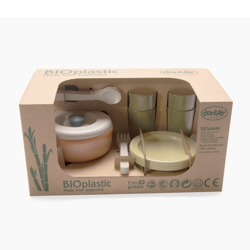 Jedálenská sada v krásnych trendy farbách, vyrobená z bioplastu. Nabáda k hre a učeniu a je ideálny pre vnútorné aj vonkajšie použitie.