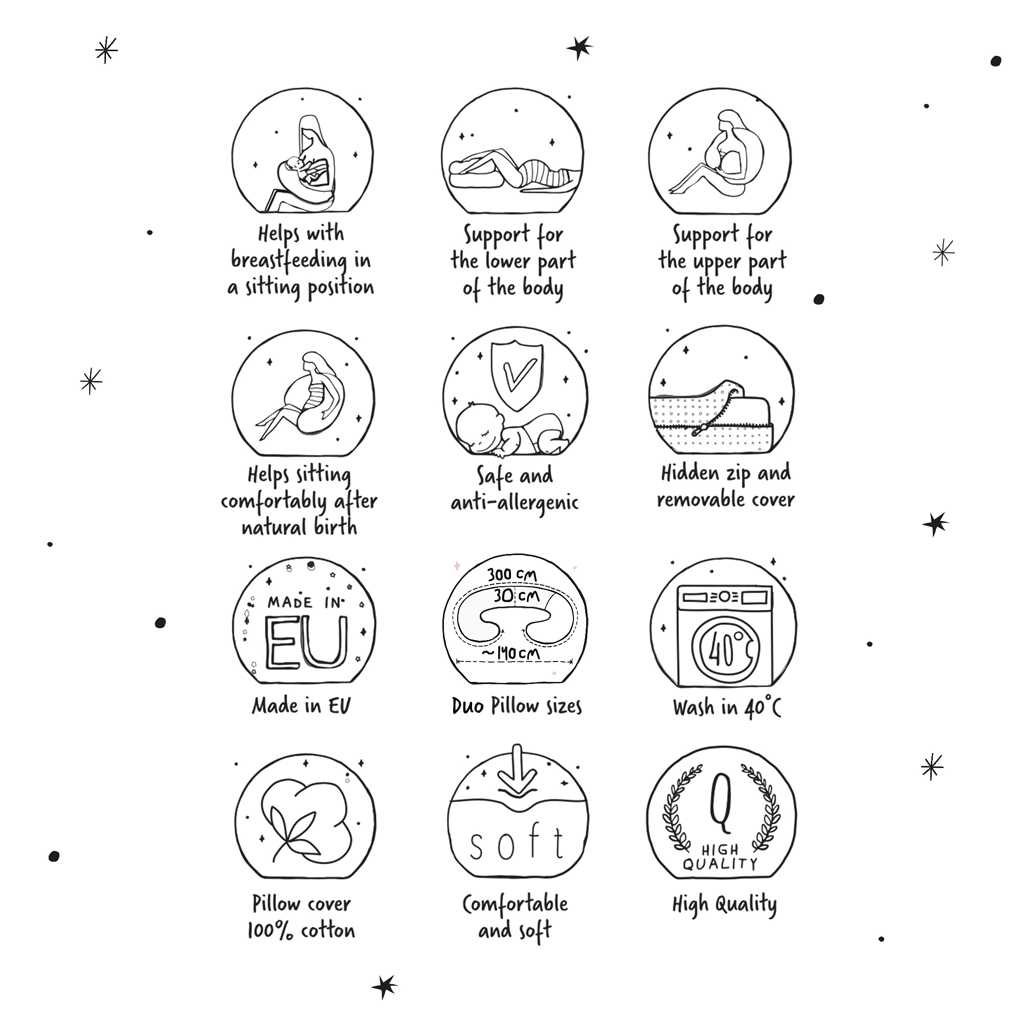 Cebuška DUO – multifunkčný vankúš je určený pre tie najnáročnejšie mamičky na svete. Je to najväčší vankúš pre tehotné ženy a dojčiace matky. Jeho inovácia spočíva v dvojdielnej konštrukcii a použití dvoch rôznych výplní.