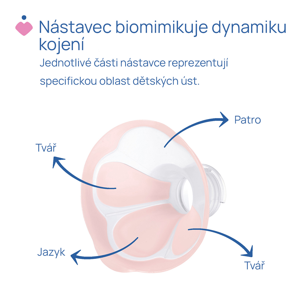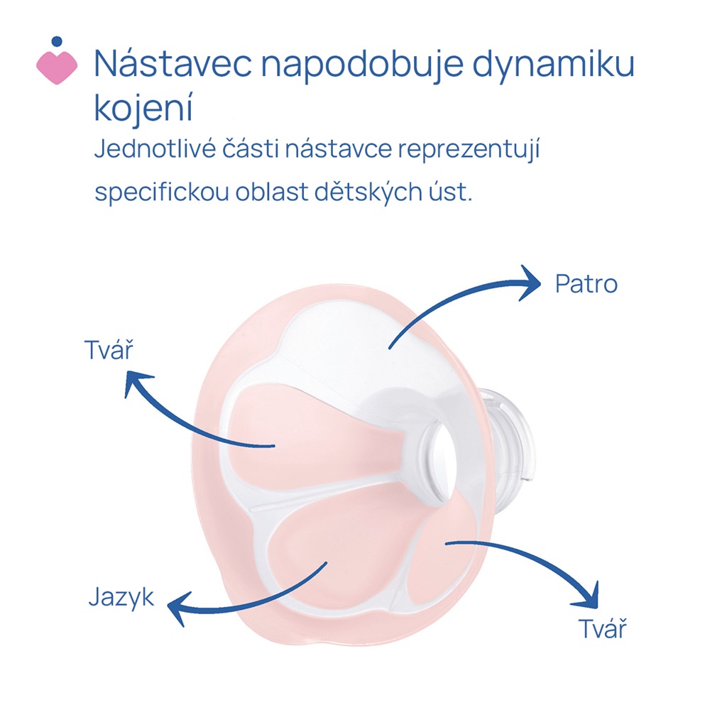 – Fyziologická masáž – ružové vystúpené časti na nástavci odsávačky napodobňujú pohyby jazyka a tvárou dieťaťa