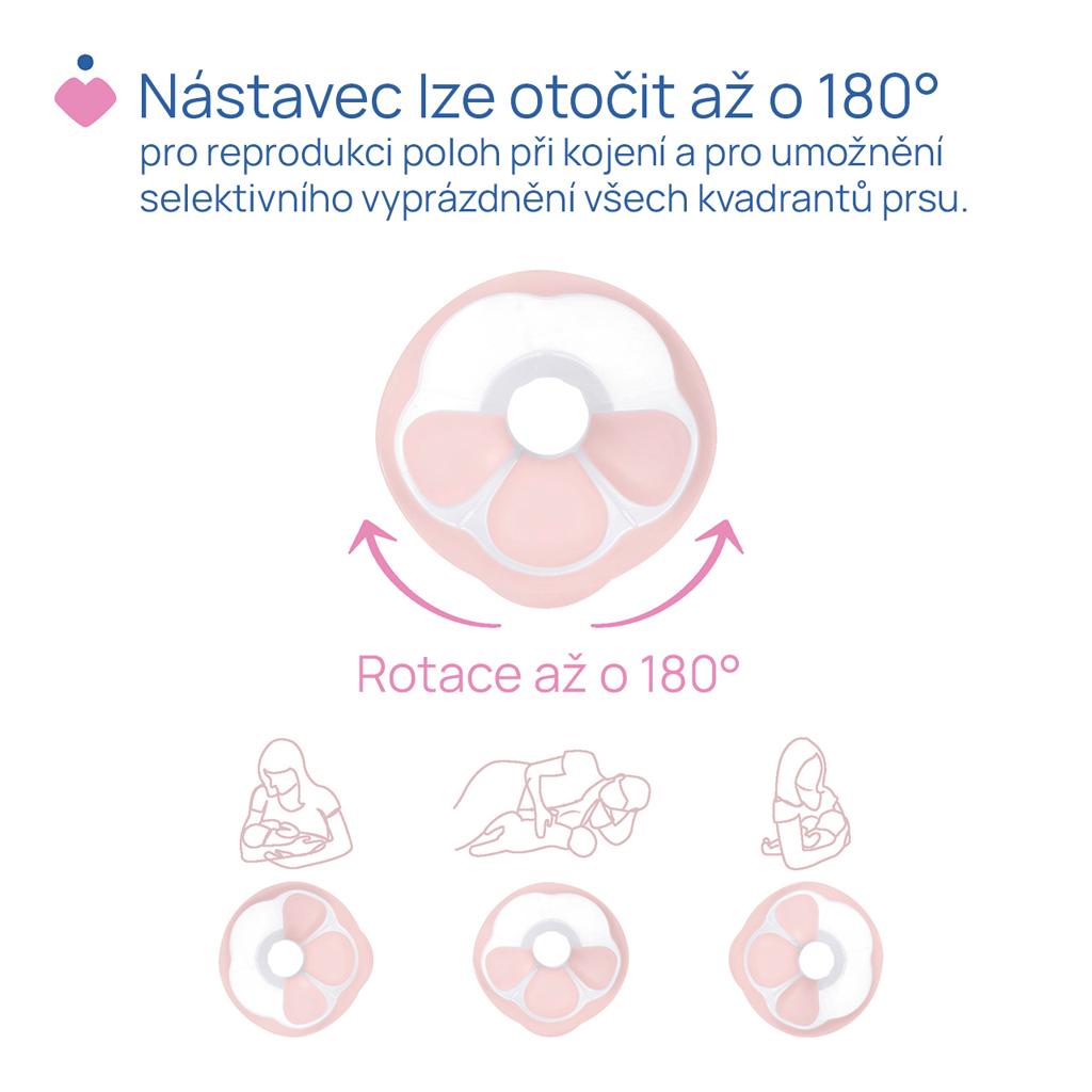 – Úplné vyprázdnenie pŕs – ružové časti na silikónovom nástavci reprodukujú prirodzené polohy pri dojčení a otáčajú sa až o 180°