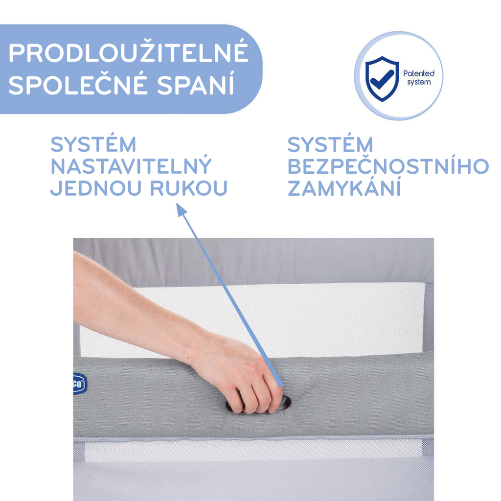 – patentovaný systém zabraňuje tomu, aby bočná strana zostala spustená, keď nie je detská postieľka úplne pripevnená k rodičovskej posteli