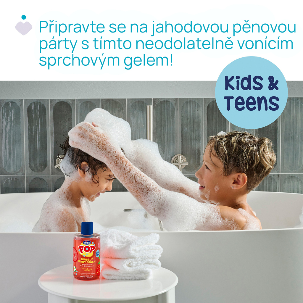 Premeňte každodenné sprchovanie na hravý a voňavý zážitok s Chicco POP sprchovým gélom Strawberry Candy.