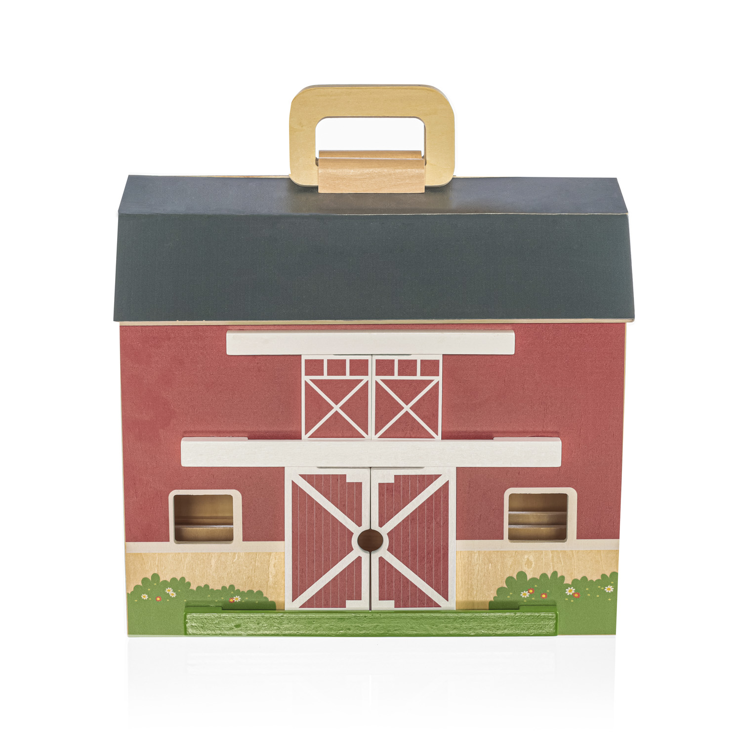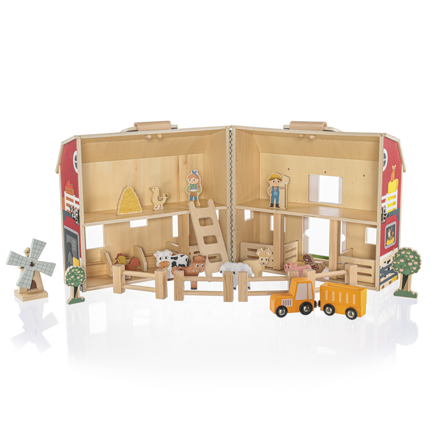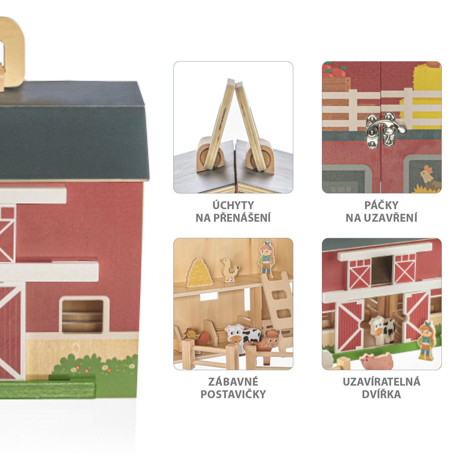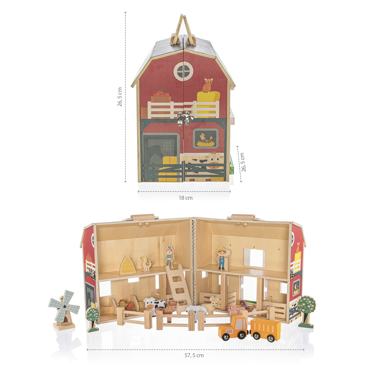 Drevená prenosná farma s aktivitami je vyrobená z odolného dreva a používa
