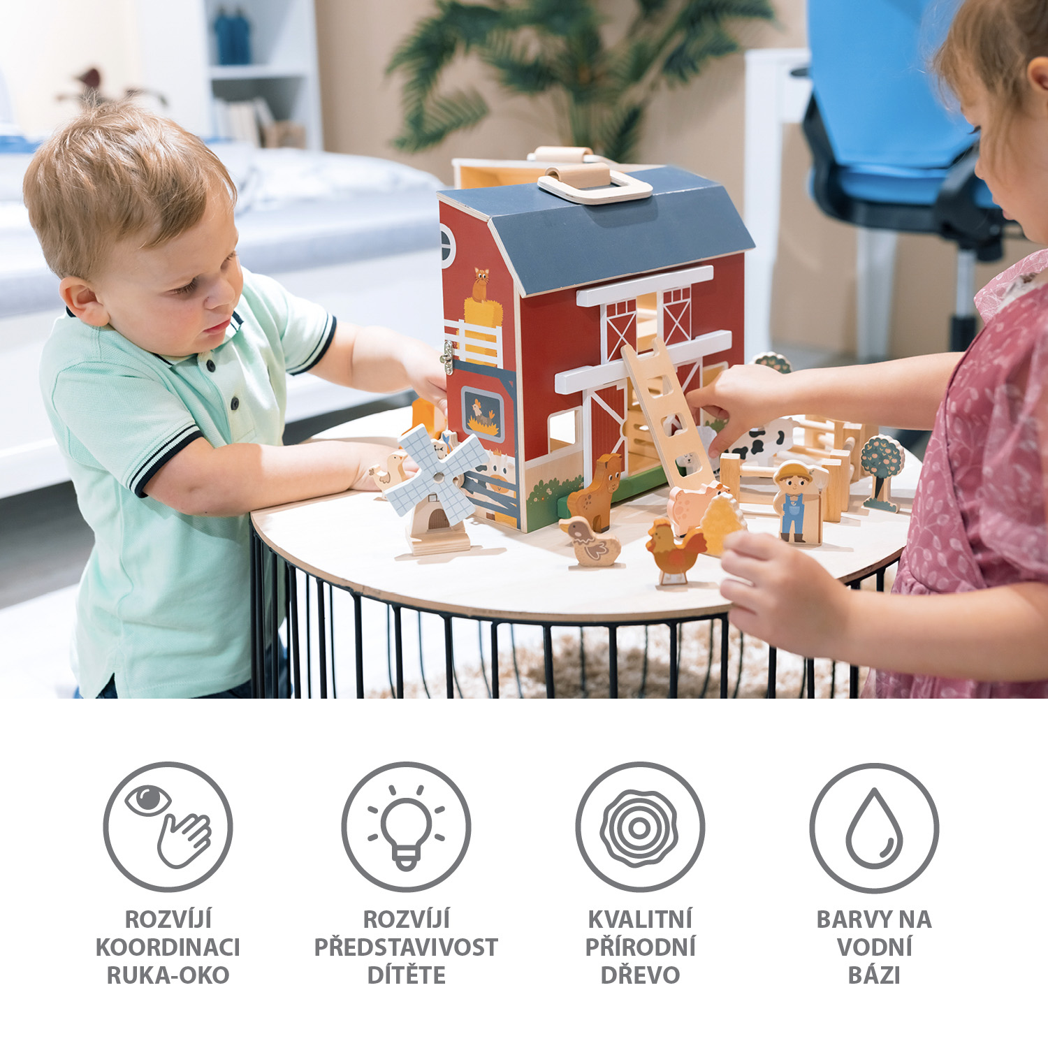 poskytuje dlhé hodiny bezstarostnej zábavy. Drevená farma na hranie je navrhnutá