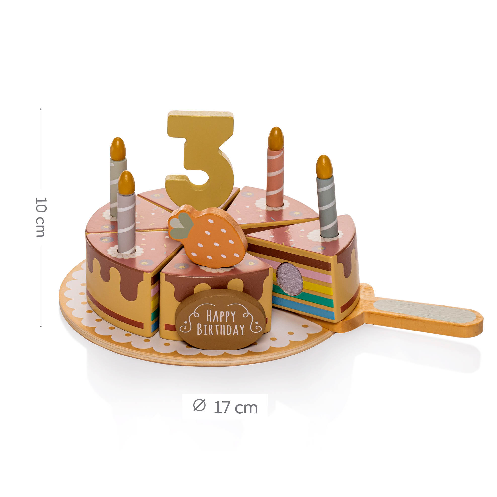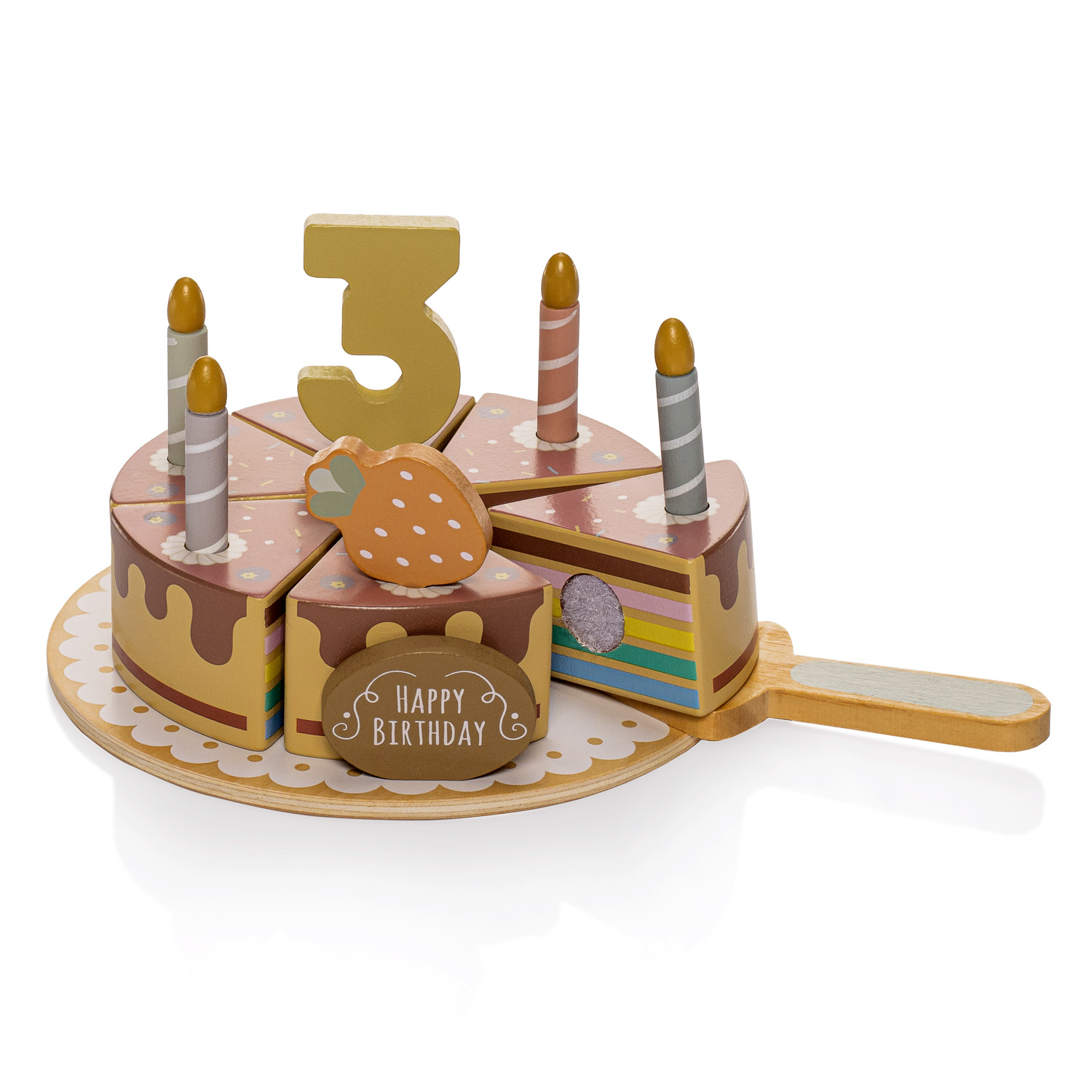 lopatku na krájanie, jahodu, tabuľku „Happy Birthday“