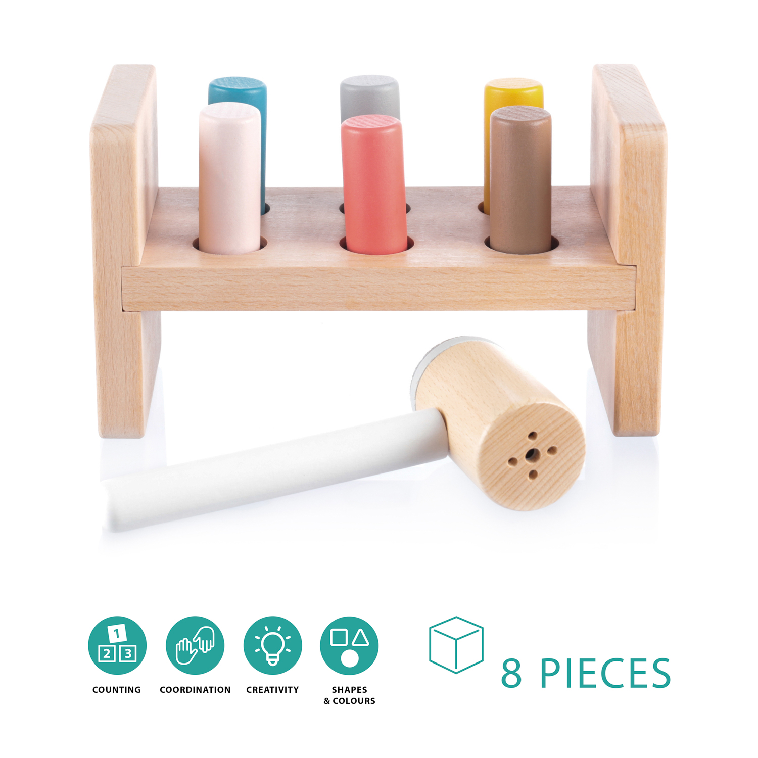 drevený stôl s otvormi, 6 farebných kolíkov a kladivo.