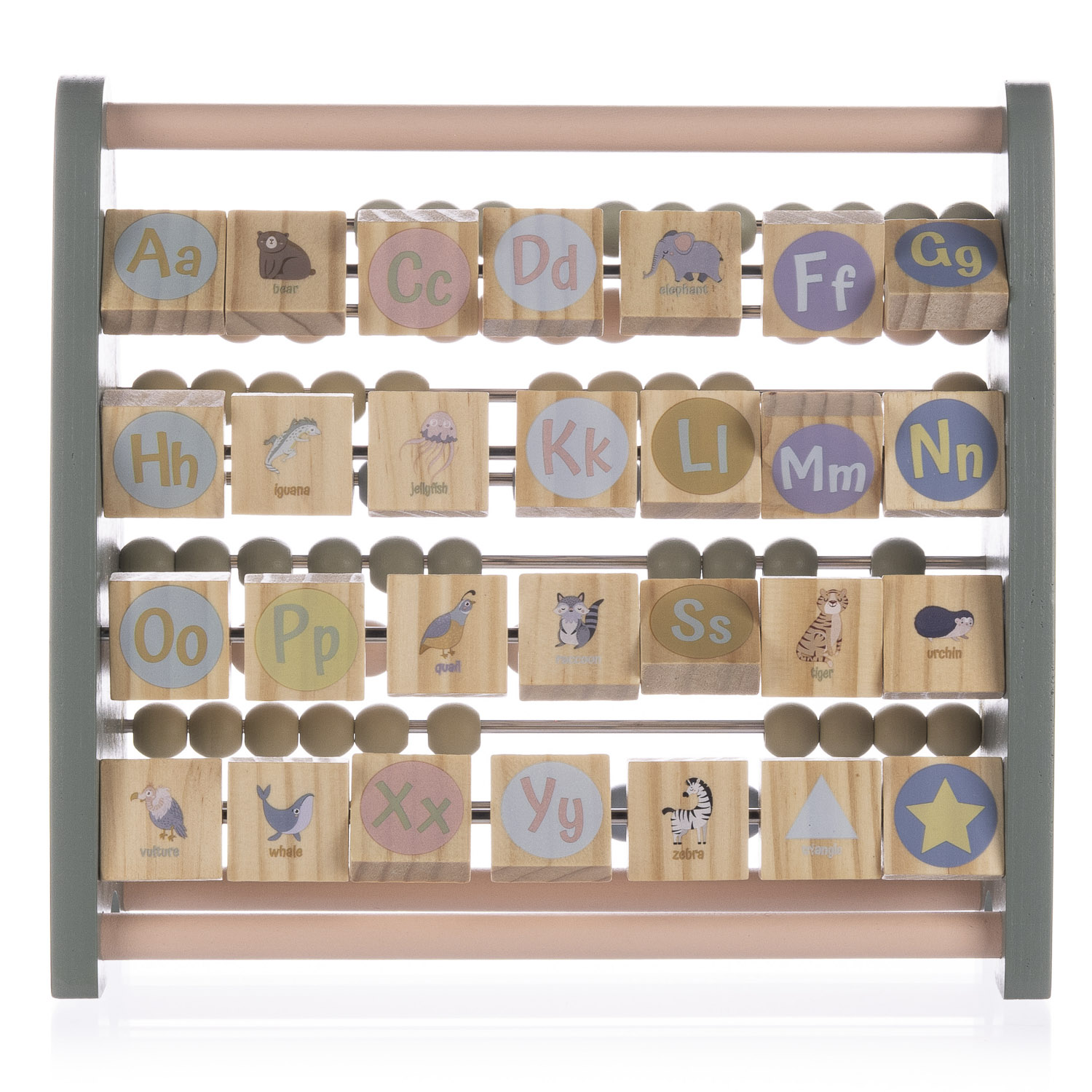 počítadlo s korálkami, z druhej abeceda s obrázkami a tvarmi