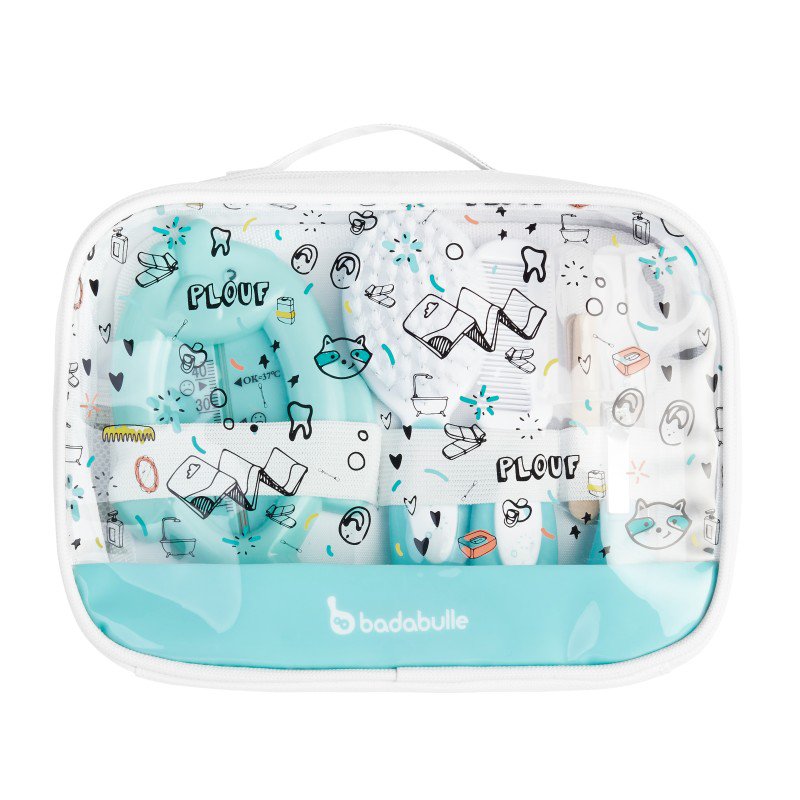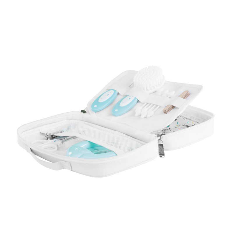 Hygienický set obsahujúci: 1 hrebienok, 1 kefku na vlásky, 1 zaoblené nožnice, 4 pilníčky, 1 klieštiky na nechty, 1 silikónovú kefku na masírovanie ďasien a 1 teplomer do vody.