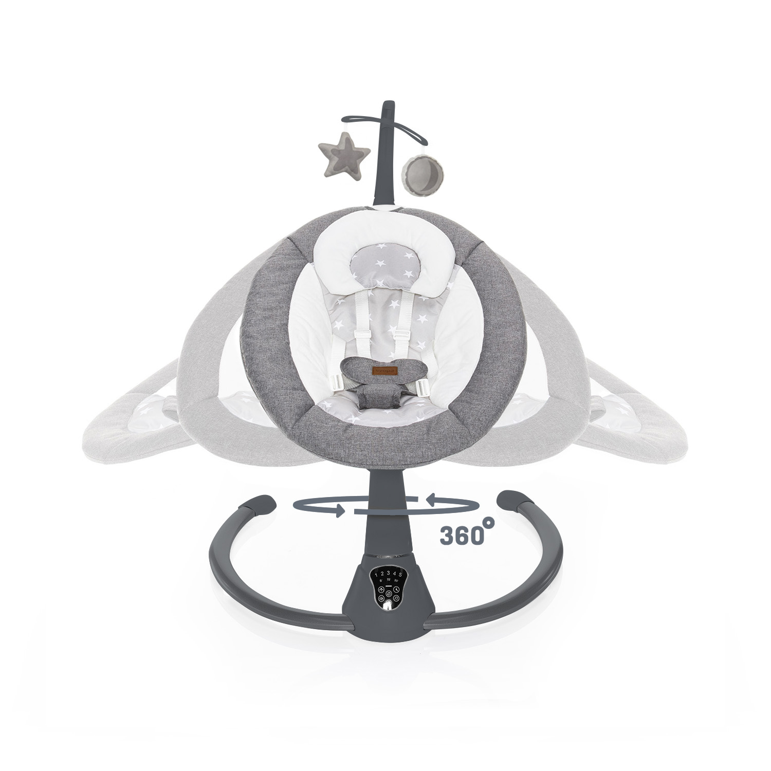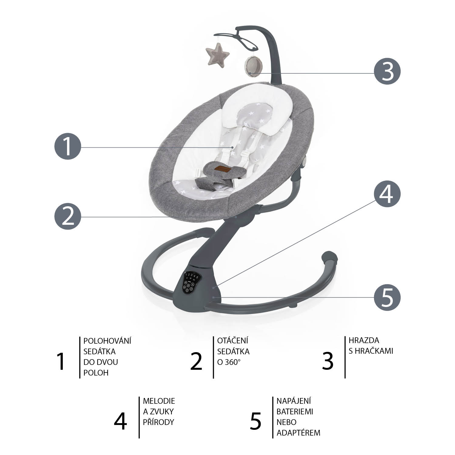 Otáčanie o 360°, 5 úrovní intenzity hojdania, automatické zapnutie,