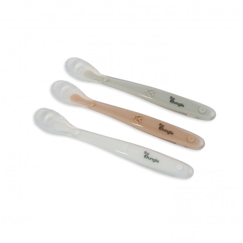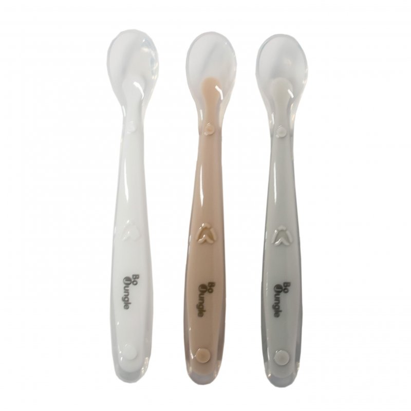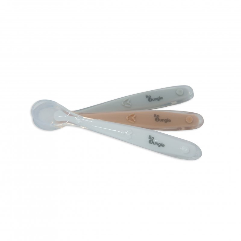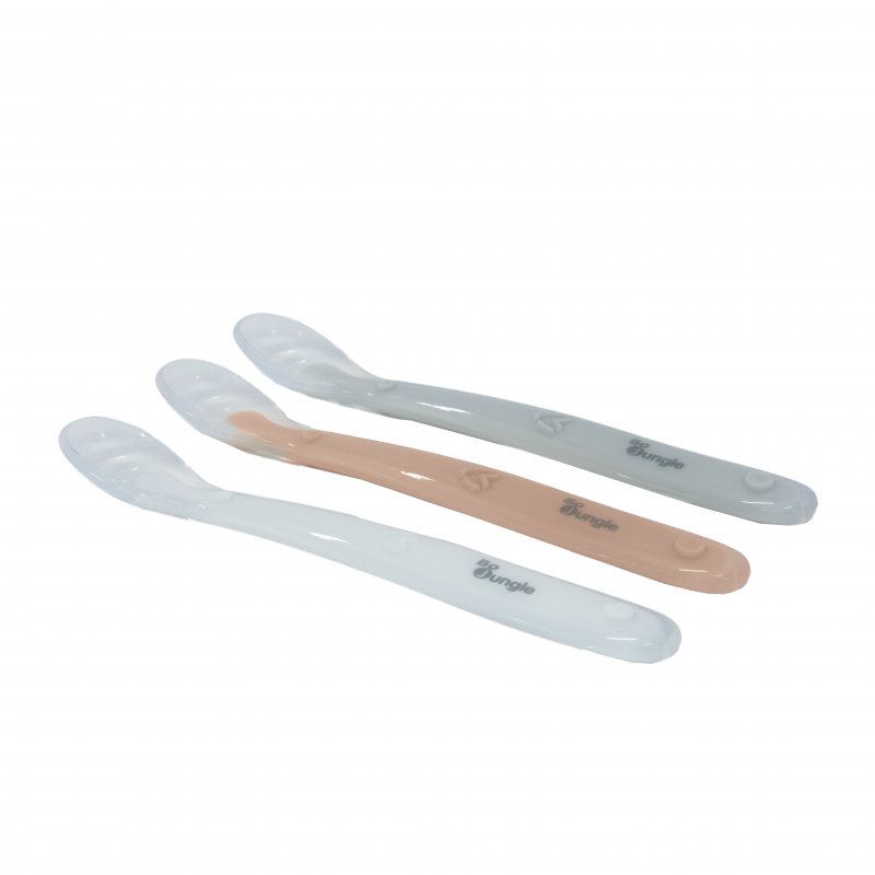 Jedálenské lyžičky s mäkkými silikónovými zakončeniami, ktoré sú šetrné k citlivým detským ďasnám.