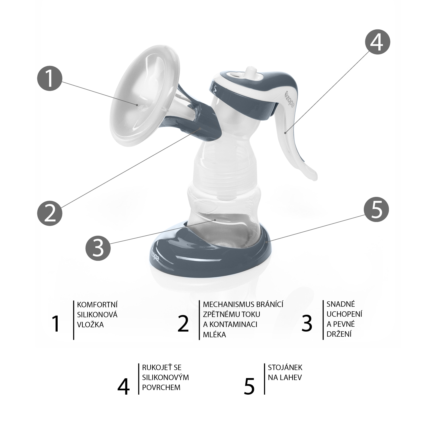 Manuálna odsávačka mlieka BASIC je vybavená unikátnou mäkkou silikónovou vložkou Zopa 3D. Pomocou tejto vložky odsávačka dokonale napodobňuje prirodzené satie dieťaťa. Zopa 3D vložka rozdeľuje samotný priebeh odsávanie na tri časti: masáž, stisk a sanie. Vďaka tomuto rozdeleniu odsávačka dosahuje maximálnej efektivity pri odsávaní a zároveň predchádza nepríjemným pocitom, ktoré môže odsávanie spôsobiť.