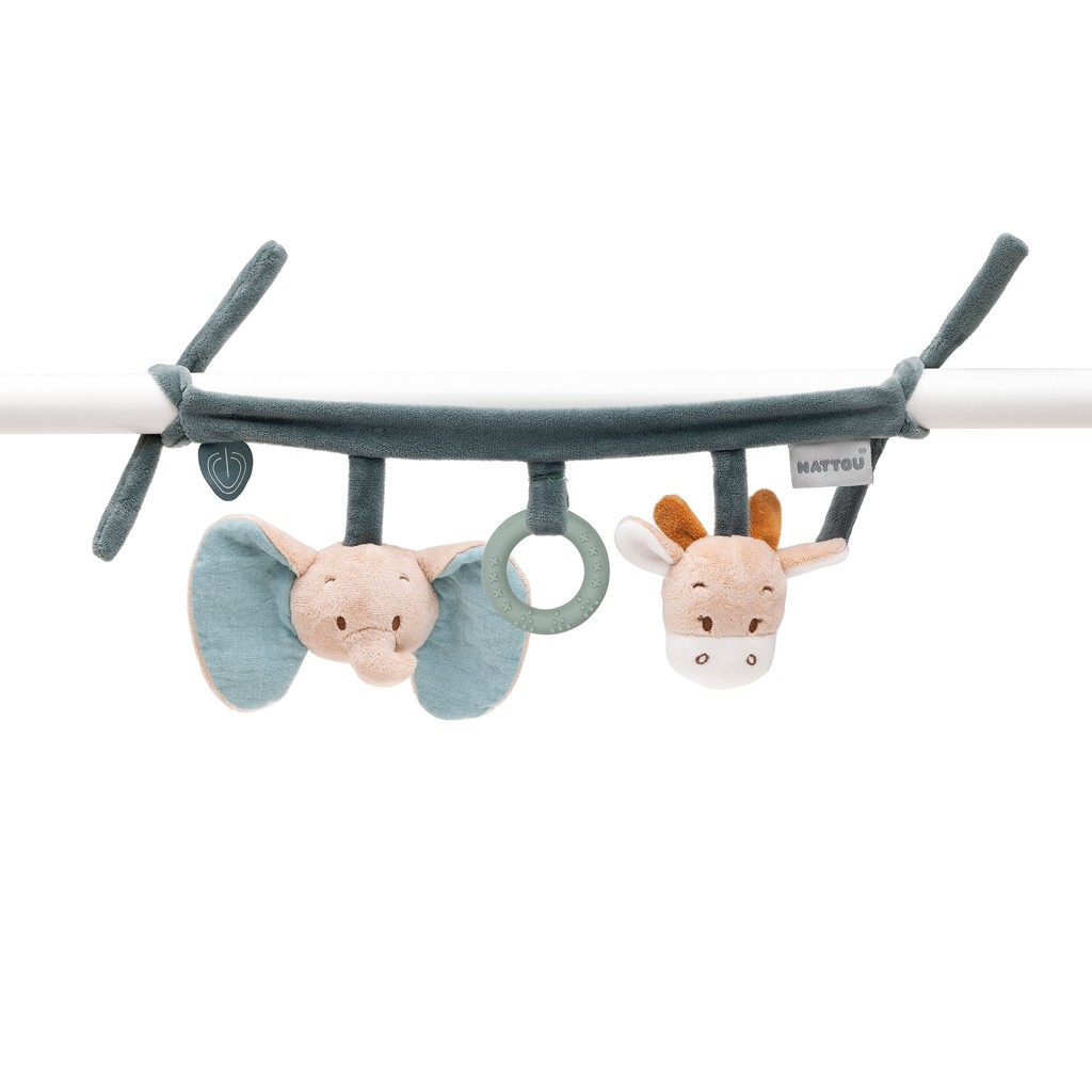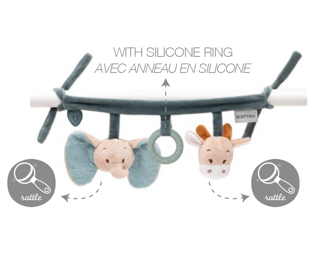 -obsahuje silikónovú hryzačku a dve hrkálky v tvare hlavy sloníka a žirafy