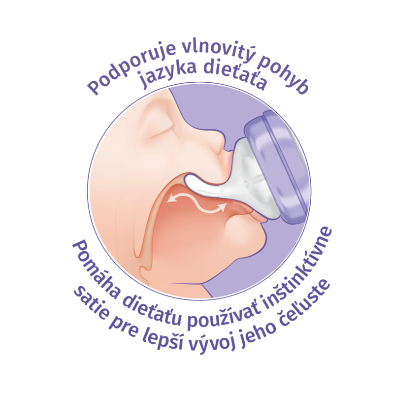 • pri kŕmení je nutný vlnový pohyb jazyka bábätka, čo podporuje prirodzený vývoj ústnej dutiny
