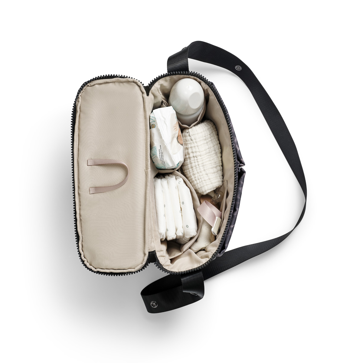 Pomocou patentiek na ramennom popruhu ľahko a rýchlo pripevníte organizér na rukoväť kočíka.