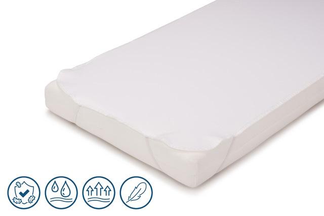 Mäkký bavlnený chránič jersey je veľmi príjemný na dotyk, dobre saje vlhkosť a zároveň zostáva priedušný. Bábätko sa bude cítiť pohodlne a príjemne. Matrac zároveň zostane chránený pred pretečenou plienkou alebo nehodami. Možné používať samostatne alebo ako nepremokavý podklad pod plachtu.