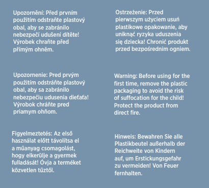 UPOZORNENIE Pred prvým použitím odstráňte plastový obal, aby sa zabránilo nebezpečiu udusenia dieťaťa! Výrobok chráňte pred priamym ohňom.