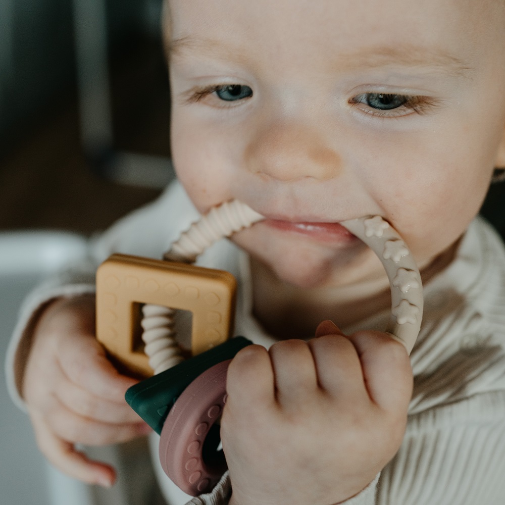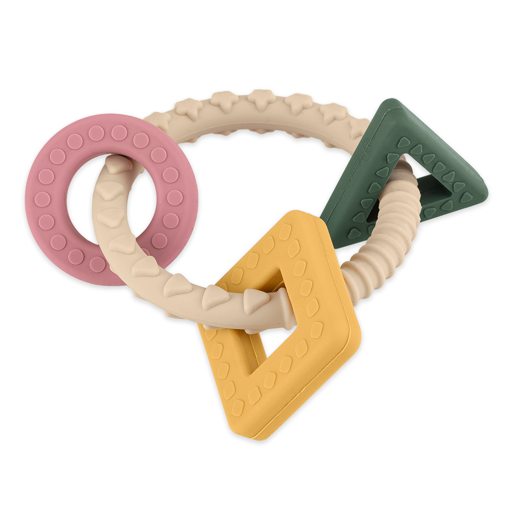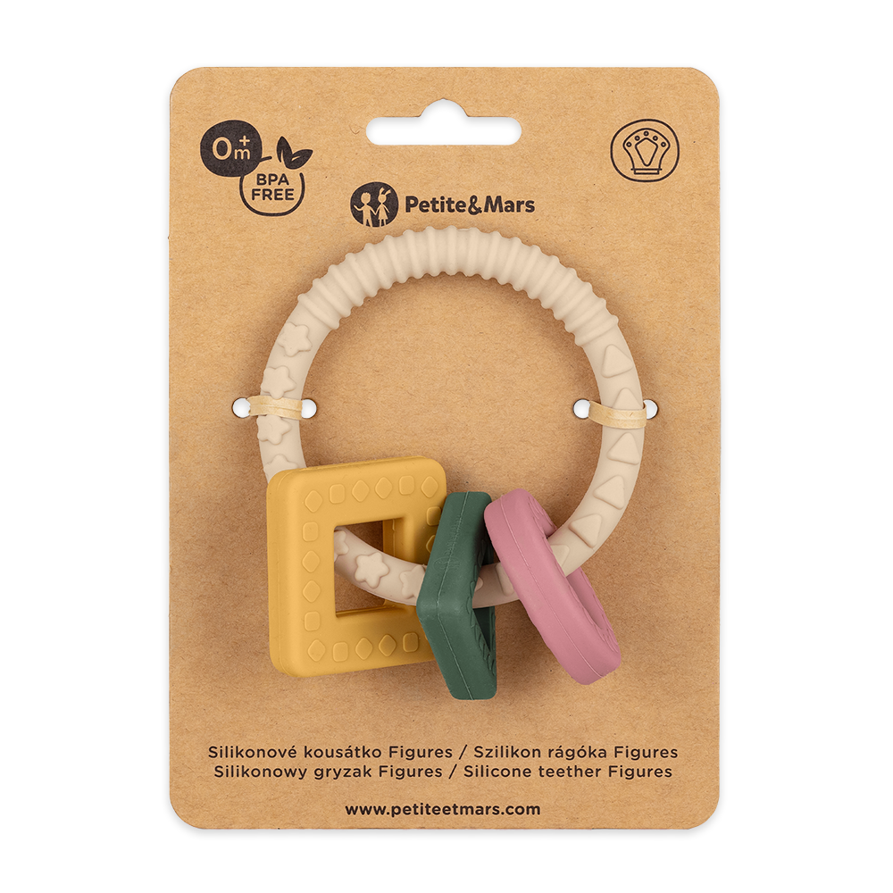 Silikónové hryzátko FIGURES, ktoré sa skladá z krúžku s výstupkami, na ktorých sú geometrické tvary, umožňuje vášmu dieťaťu objavovať svet nových vnemov. Je nielen zdrojom zábavy, ale aj nástrojom, ktorý stimuluje vývoj. Rôzne tvary a textúry ponúkajú dieťaťu zaujímavé hmatové vnemy, pomáhajú skúmať hmat a korigujú rozvíjajúce sa zmyslové zručnosti.