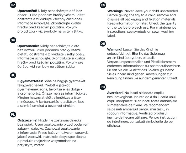 UPOZORNENIE! Nikdy nenechávajte dieťa bez dozoru. Pred podaním hračky vášmu dieťaťu odstráňte a zlikvidujte všetky obaly. Informácie uchovajte. Skontrolujte si kvalitu hračky pred každým použitím. Pokyny pre údržbu, vid symboly na všitom štítku. Pred použitím sa odporúča oprať.