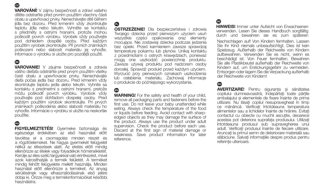 V záujme bezpečnosti a zdravia vášho dieťaťa odstráňte pred prvým použitím všetky časti obalu a upevňovacie prvky. Nenechávajte dieťa počas jedla bez dozoru. Pred kŕmením vždy skontrolujte teplotu jedla alebo tekutín. Vyhnite sa kontaktu s predmetmi a ostrými hranami, pretože môžu poškodiť povrch výrobku. Výrobok vždy používajte pod dohľadom dospelej osoby. Pred každým použitím výrobok skontrolujte. Pri prvých známkach poškodenia alebo slabosti materiálu ho vyhoďte. Informácie o výrobku si uložte na neskoršie použitie.