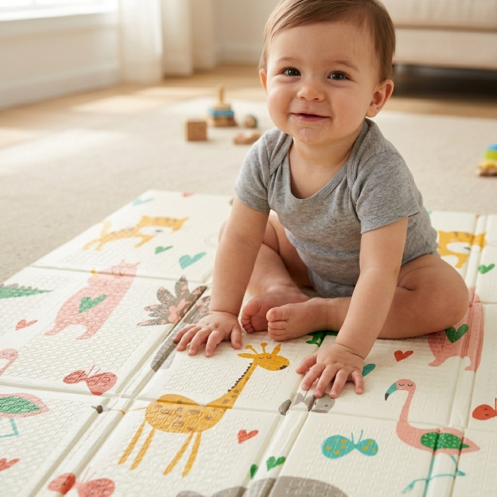Mäkká skladacia podložka pre bezpečnú hru vášho dieťatka. Vhodná od narodenia. Podložka má obojstrannú potlač s veselými motívmi, protišmykovú úpravu na povrchu, skvele izoluje a odhlučňuje, je vodeodolná, jemná na povrchu, elastická, avšak tvarovo stabilná, skladná a predovšetkým poskytuje deťom bezpečie pri hre.