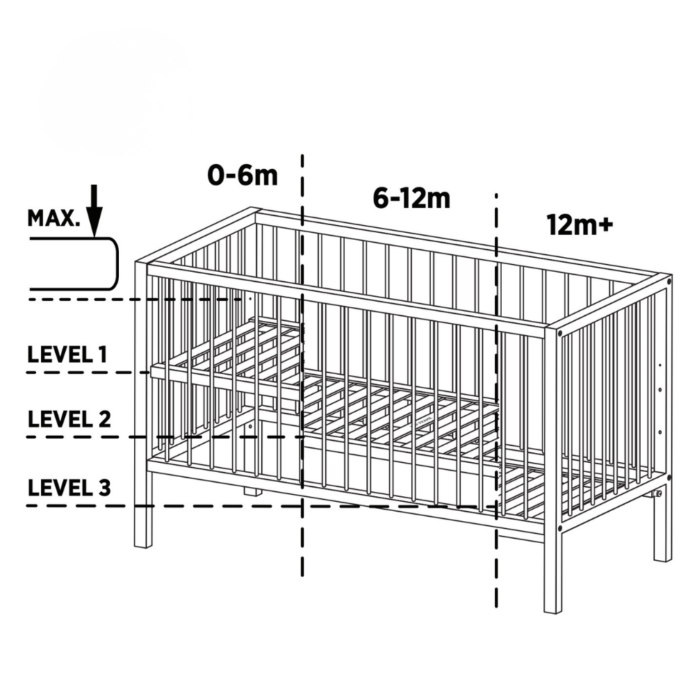 Postieľka disponuje nastaviteľným roštom v 3 výškových polohách, vďaka čomu ju jednoducho prispôsobíte veku a potrebám dieťaťa. Vyššia poloha uľahčuje manipuláciu s novorodencom, nižšie polohy zvyšujú bezpečnosť v období, keď dieťa začína sedieť alebo sa stavia na nohy.