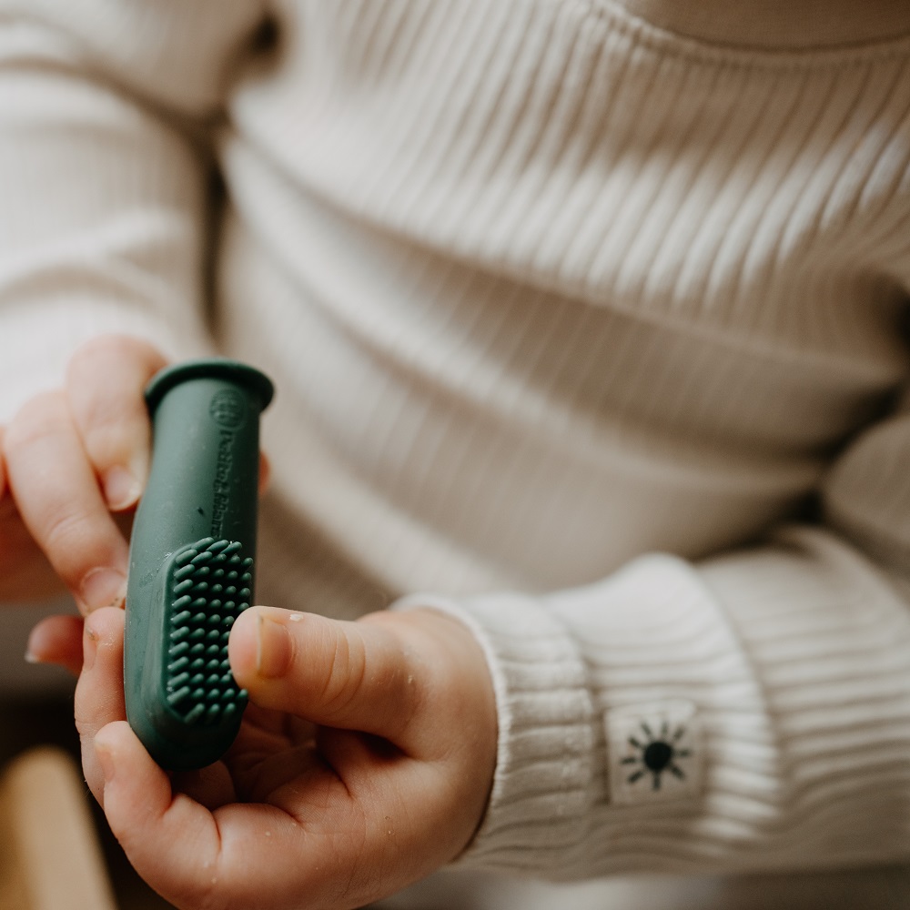 Zubná kefka v podobe krytky umiestnenej na prste rodiča je vyrobená z potravinárskeho silikónu bez BPA. Zubnú kefku stačí nasadiť na ukazovák a začať jemnú masáž ďasien a zubov vášho dieťaťa. Každodenný zdravý návyk sa tak zároveň stane príjemnou zábavou. Mäkký a pružný silikón je príjemný na dotyk a neubližuje citlivým ústam dieťaťa a pravidelné masírovanie upokojuje ďasná počas prerezávania zúbkov.