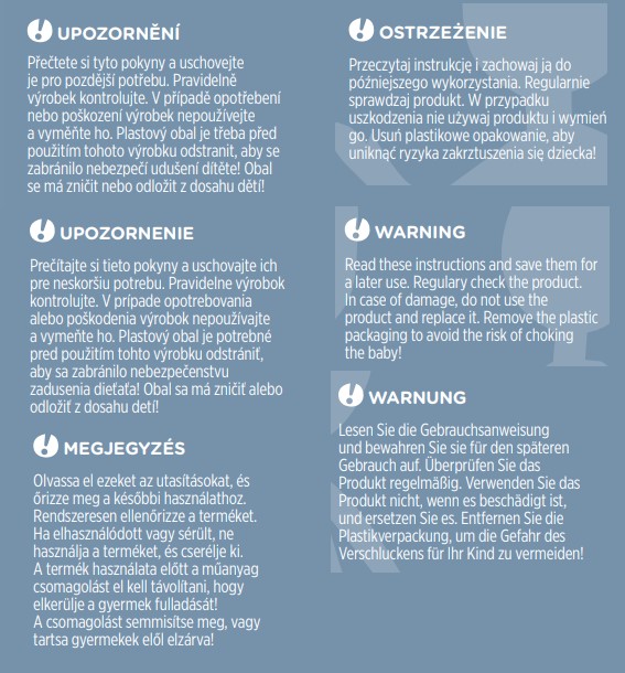 UPOZORNENIE! Pravidelne výrobok kontrolujte. V prípade opotrebovania alebo poškodenia výrobok nepoužívajte a vymeňte ho. Plastový obal je potrebné pred použitím tohto výrobku odstrániť, aby sa zabránilo nebezpečenstvu zadusenia dieťaťa! Obal sa má zničiť alebo odložiť z dosahu detí!