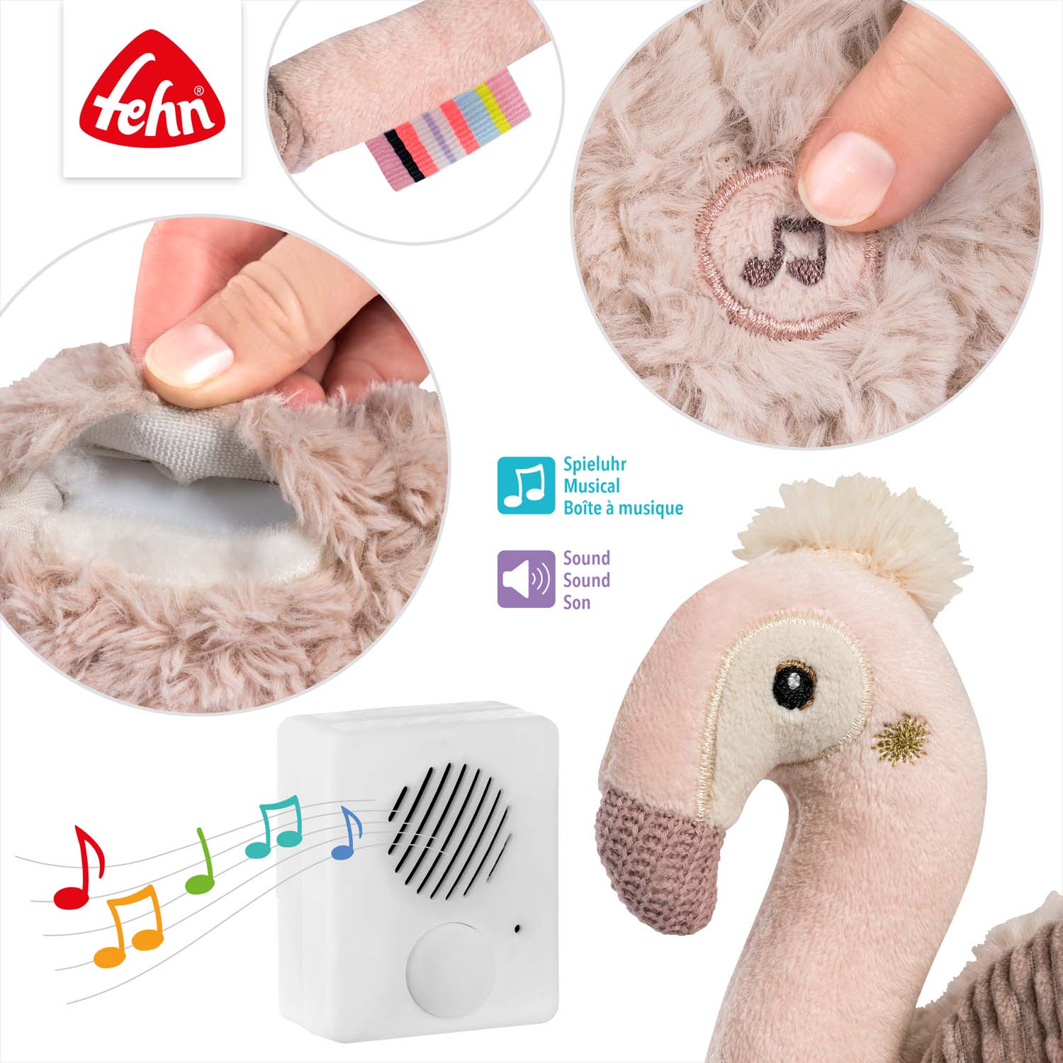 príjemnými zvukmi a hebkými materiálmi si plyšový plameniak získa srdce každého