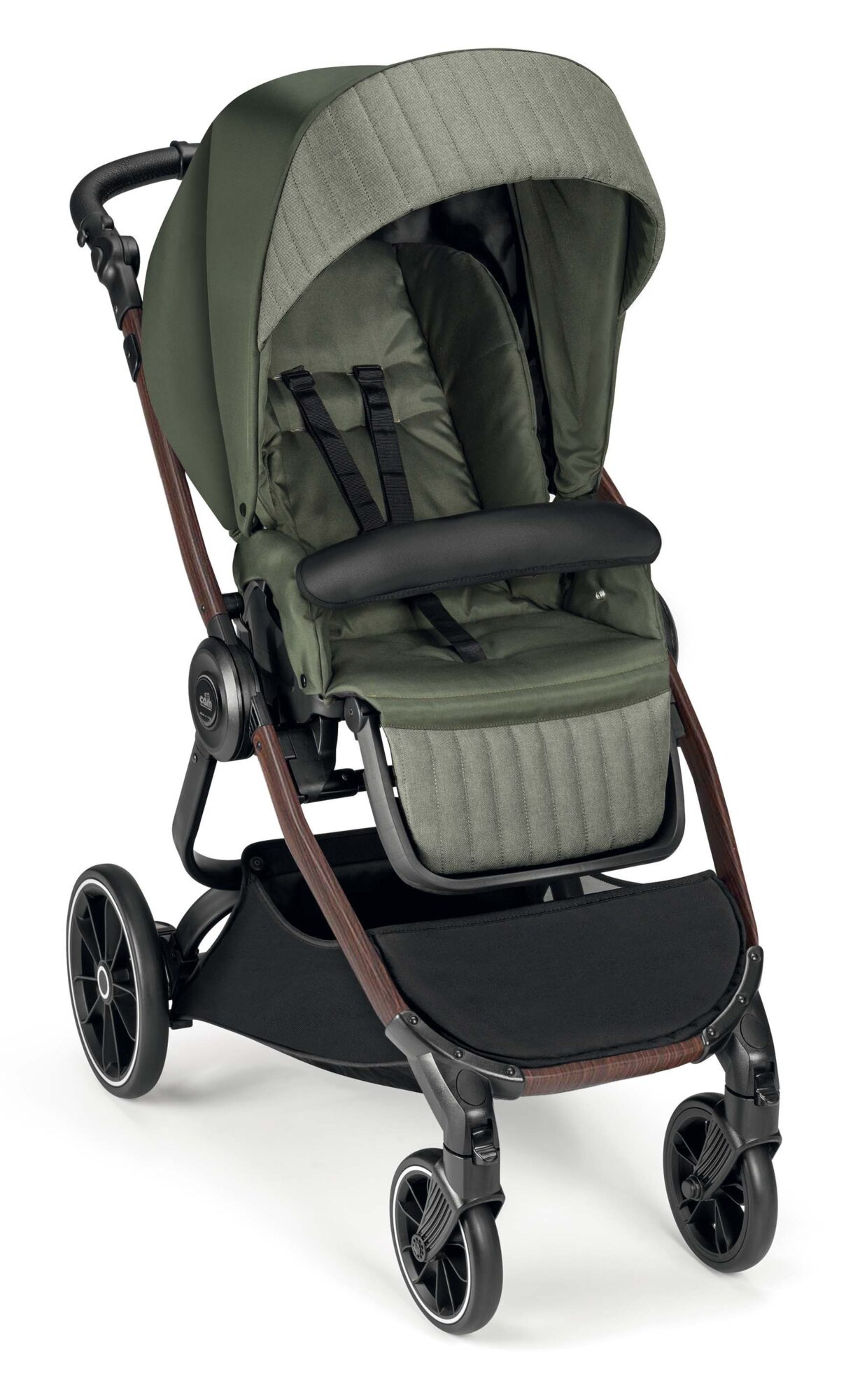 rukoväť s ručným prešívaním z ekokože dopĺňa tento štýlový a praktický kočík.