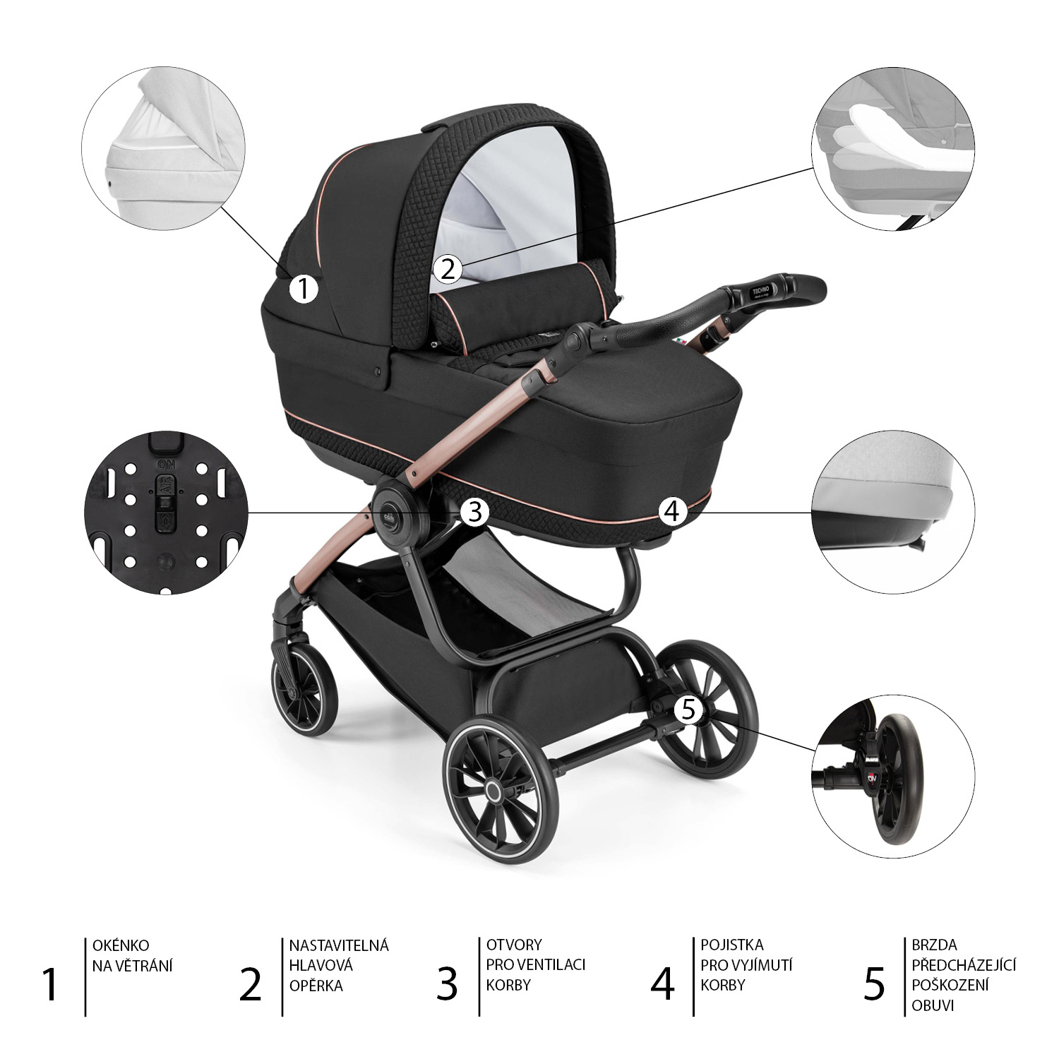 Podvozok Techno má odpruženú konštrukciu a praktické nástavce, ktoré sa dajú
