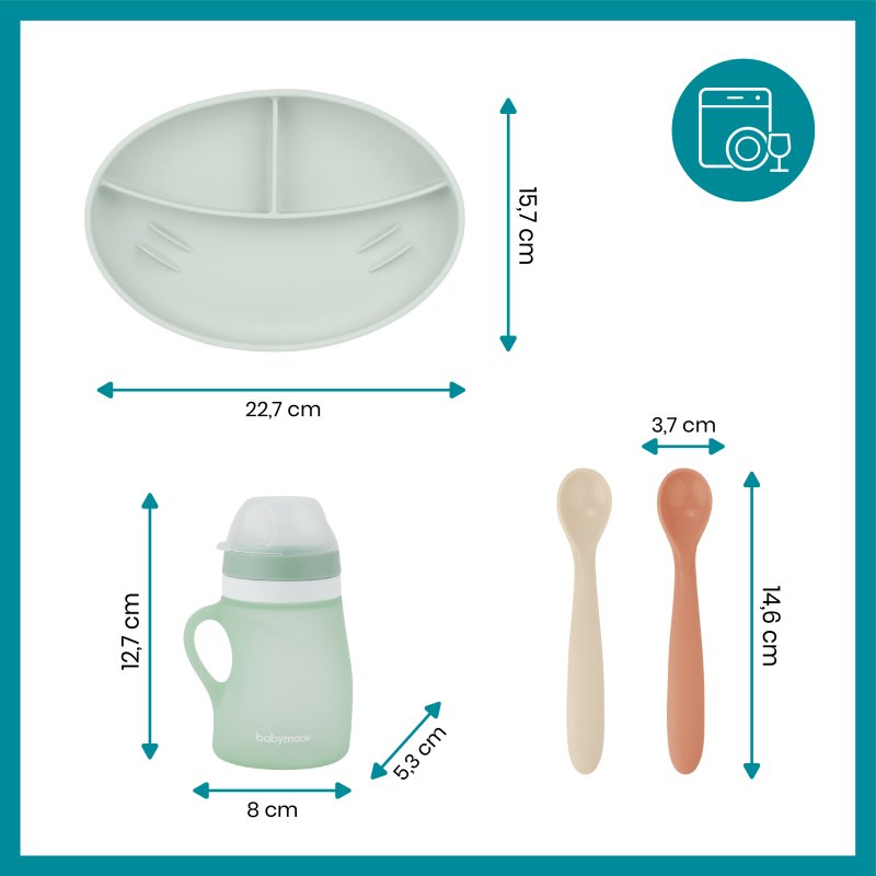 Detská jedálenská súprava GROW’ISY KIT je ideálna pre deti vo veku od 24 do 36 mesiacov. Je navrhnutá na samostatné jedenie a objavovanie chutí. Obsahuje tanier s prísavkou, 2 lyžičky a fľaštičku – všetko vyrobené z mäkkého, potravinárskeho silikónu.
