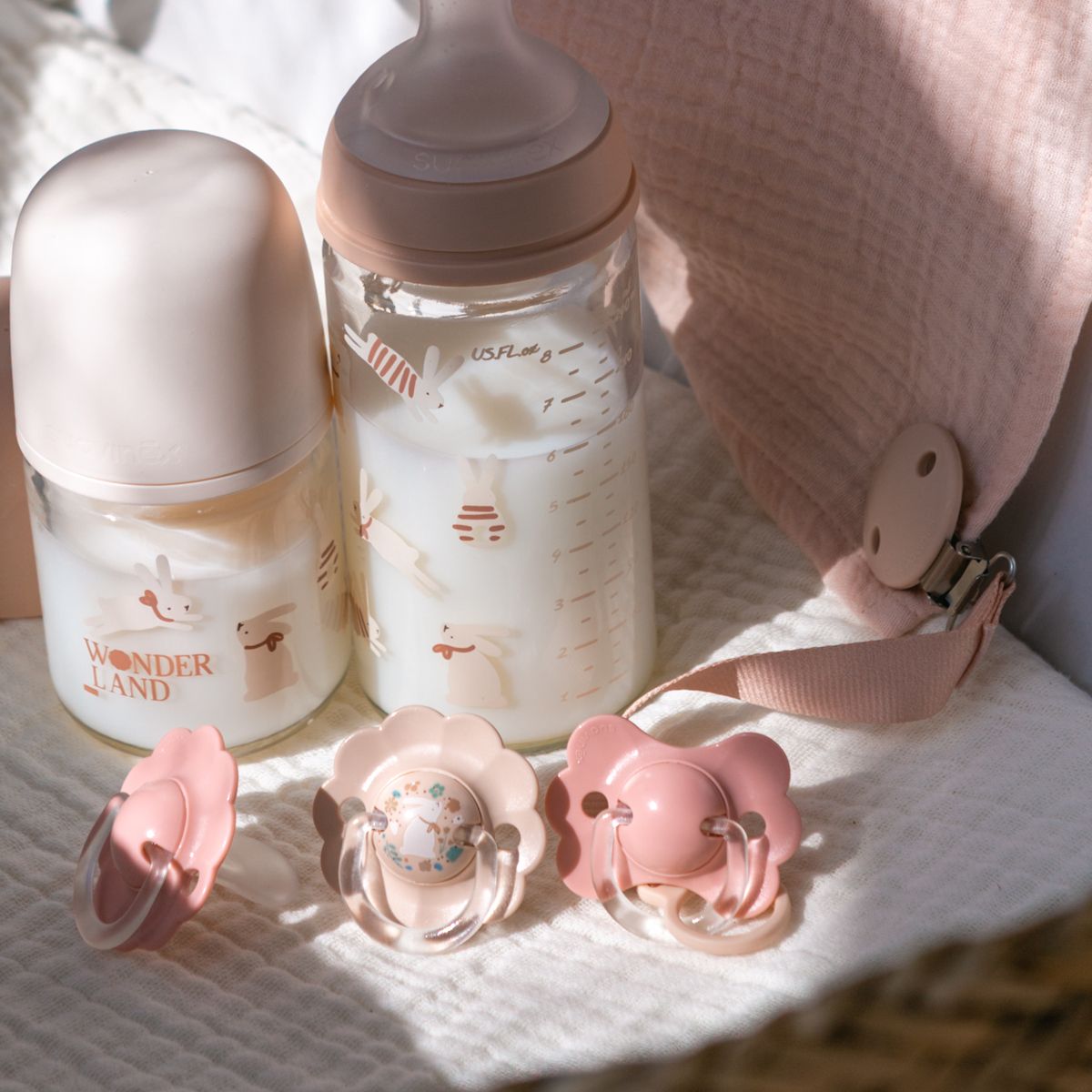 Cumlíky Wonderland Butterfly sú vybavené fyziologickou sacou časťou SX Pro zo silikónu, ktorá rešpektuje prirodzený vývoj ústnej dutiny dieťaťa. Vďaka plochému a symetrickému tvaru sa vždy správne prispôsobí v ústach.