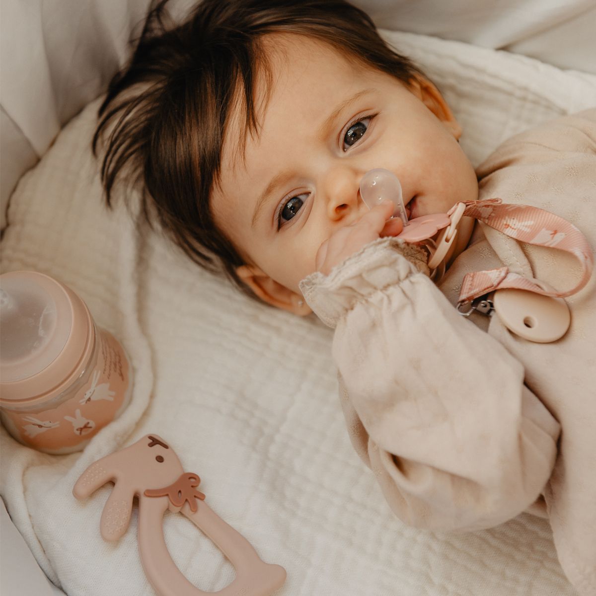 – 1 textilný klip na cumlík, ktorý zabraňuje pádu alebo strate cumlíka