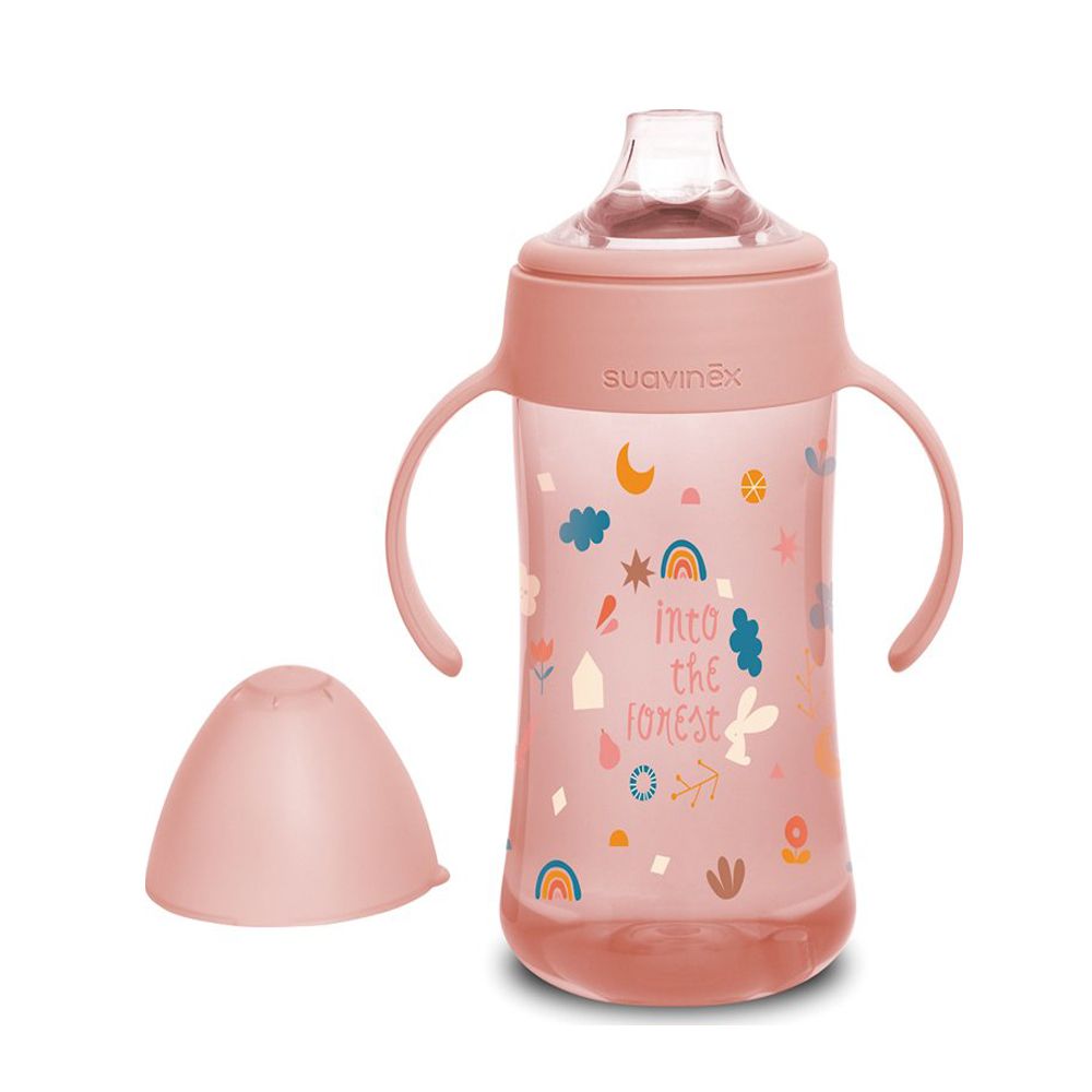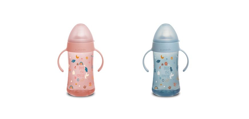Druhá fľaša s uškami so špeciálnym cumlíkom uľahčuje prechod z dojčenskej fľaše na pitie z hrnčeka či pohára. Silikónový náustok je mäkký a materiálovo zhodný s cumlíkmi dojčenských fliaš, preto ho Vaše deti prijmú rýchlejšie ako bežná tvrdá pítka. Prvá fľaša má ergonomický tvar a držadlá vhodná pre drobné detské ruky, ktoré umožnia jej ľahké uchopenie.