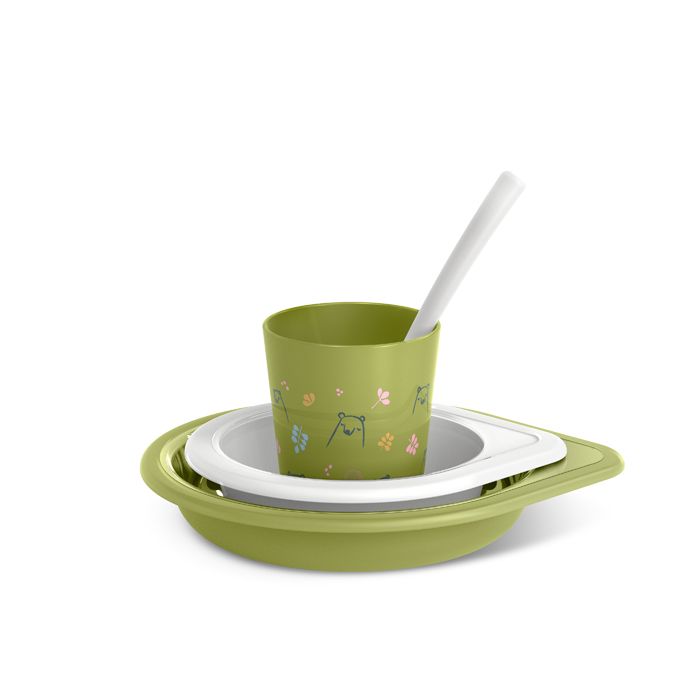 Naučiť sa jesť samostatne je zábava – čas obeda alebo desiatky sa s našimi potrebami na kŕmenie premení v príjemnú a zábavnú skúsenosť. Jednotlivé komponenty sú vyrobené z polypropylénu, plastu, ktorý neobsahuje BPA. Sú praktické, ľahké (vďaka ľahkosti ich môže dieťa pohodlne používať samo) a nerozbitné. Ich tvary a zaoblené hrany dodávajú nutnú bezpečnosť, aby sme ich bez obáv nechali jesť samostatne. Obsahuje praktickú protišmykovú podložku, aby tanierik nešmýkal.