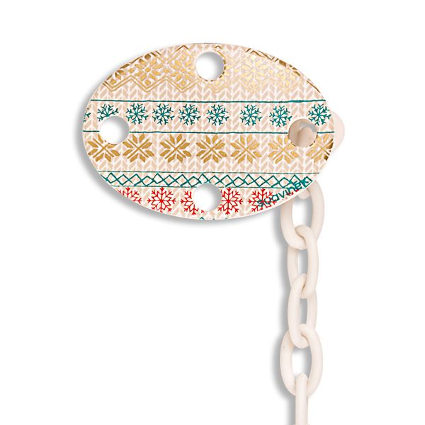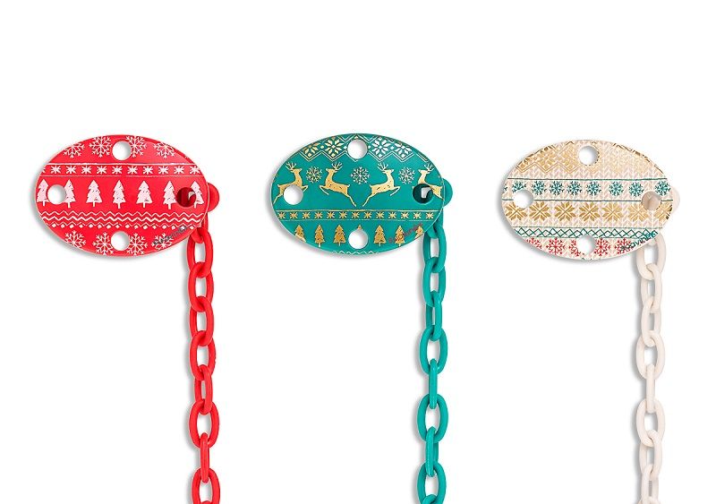 Oválny klip s veselými obrázkami a retiazkou, ku ktorému pohodlne pripnete cumlík. Klip umožňuje upevniť cumlík na oblečenie dieťaťa a predchádza prípadnému upadnutie cumlíka na nečistú zem alebo jeho strate.