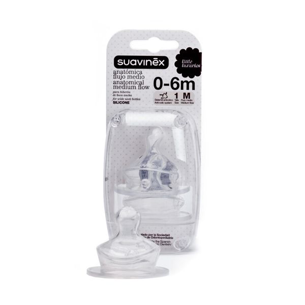 Širokohrdlé náhradné cumlíky Suavinex sú kompatibilné so všetkými širokohrdlými fľašami značky Suavinex.