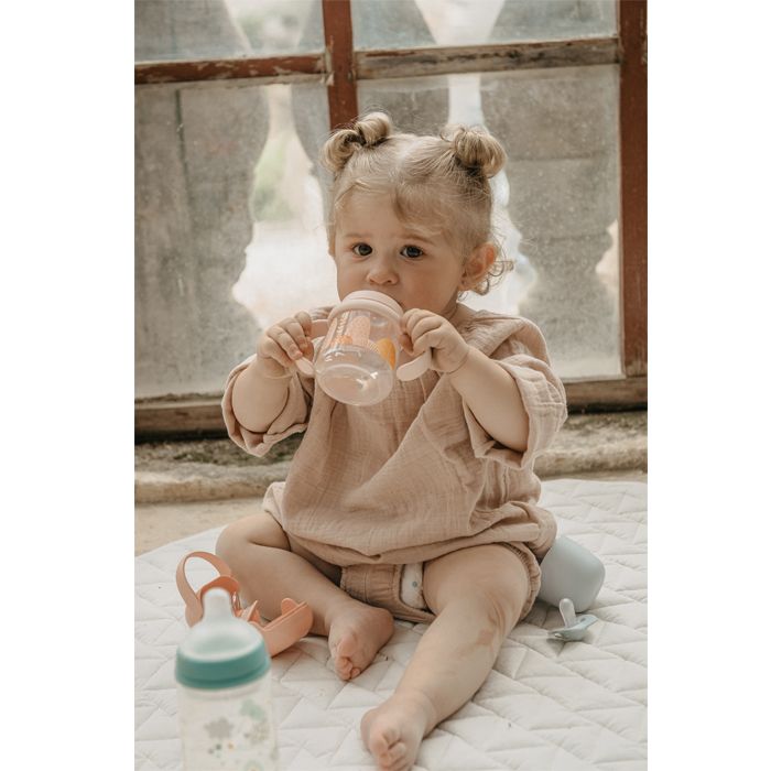 Prvá fľaša s uškami so špeciálnym SX ProTM antikolikovým cumlíkom uľahčuje prechod z dojčenskej fľaše na pitie z hrnčeka či pohára. Silikónový náustok je mäkké a materiálovo zhodné s cumlíky dojčenských fliaš a cumlíkov SX ProTM . Preto ho Vaše deti prijmú rýchlejšie ako bežný tvrdý náustok.