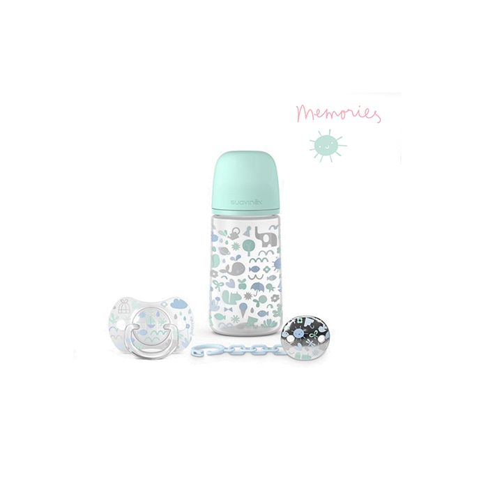 SUAVINEX | SADA FĽAŠA 270ml + cumlík fyziologický 0/6m + klip MEMORIES – modrý