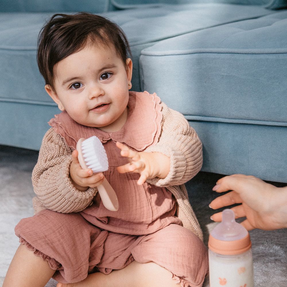 Set hrebeňa a kefky je ideálnym pomocníkom pre každodennú starostlivosť o vlásky dieťatka. Doprajte jemnú masáž aj bábätku, ktoré má len jemné páperie. Kefa aj hrebeň sú bez ostrých a nebezpečných hrán, ktoré by mohli byť dieťaťu nebezpečné. Zuby hrebienka majú zaoblené konce a vlákna kefky sú mäkučké a pružné. Ideálne pre jemnú detskú pokožku aj vlásky, vhodné pre bábätká od narodenia.