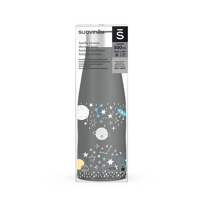 Termo nerezová fľaša na tekutiny s motivom Vesmíru značky Suavinex je ideálna pre uchovanie a prepravu teplých i chladných nápojov – uchováva teplotu tekutín po dobu až 4 hodín. Je veľkým pomocníkom pri výletoch s deťmi von alebo na prípravu mlieka vopred pre nočné kŕmenie.