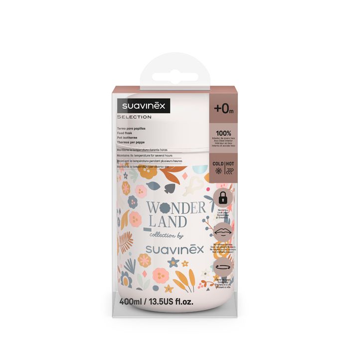 Termoska na príkrmy radu WONDERLAND značky Suavinex umožňuje prepravovať pyré alebo pevné potraviny – uchováva teplotu po dobu až 6 hodín. Je veľkým pomocníkom pri výletoch s deťmi von alebo pri príprave príkrmov vopred na nočné kŕmenie. Teplota sa neprenáša na povrch nádoby.