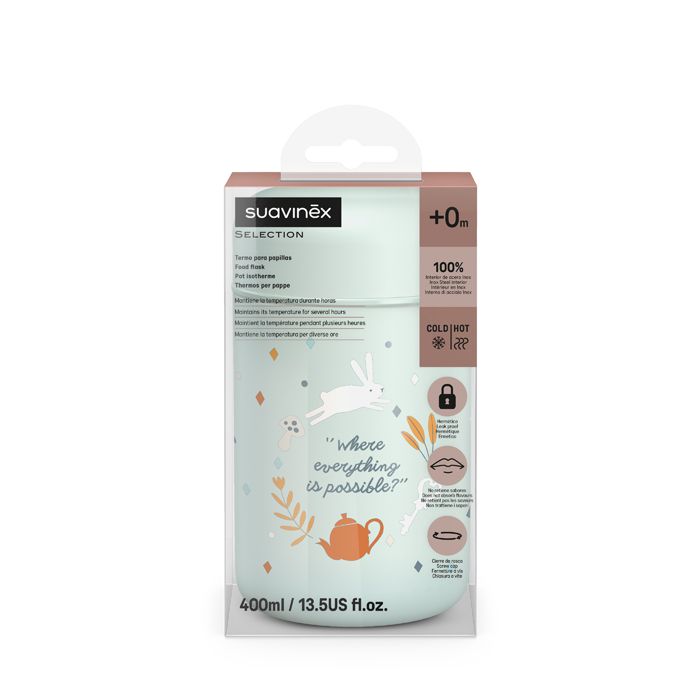 Termoska na príkrmy radu WONDERLAND značky Suavinex umožňuje prepravovať pyré alebo pevné potraviny – uchováva teplotu po dobu až 6 hodín. Je veľkým pomocníkom pri výletoch s deťmi von alebo pri príprave príkrmov vopred na nočné kŕmenie. Teplota sa neprenáša na povrch nádoby.