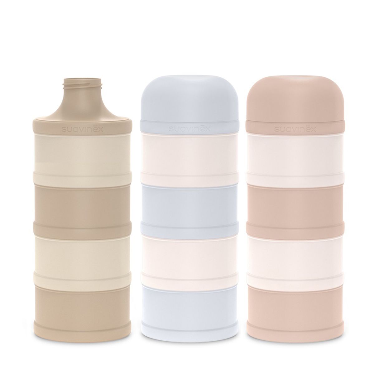 Dávkovač sušeného mlieka značky Suavinex so skrutkovacím uzáverom a stohovateľnými priehradkami. Obsahuje 4 samostatné časti.