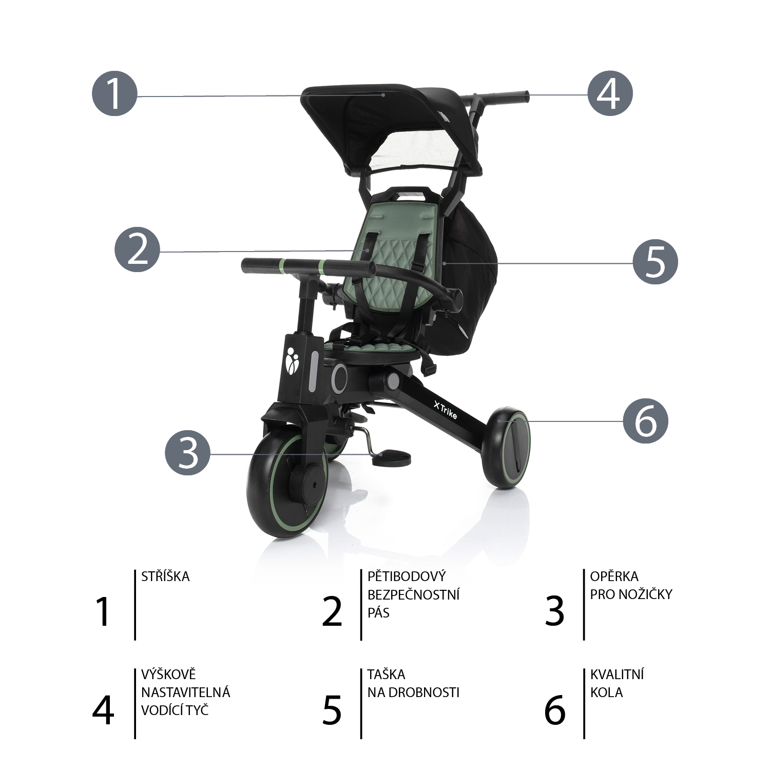 modeli trojkolky X Trike je zabezpečenie zaistené 5bodovými pásmi, nastaviteľnou