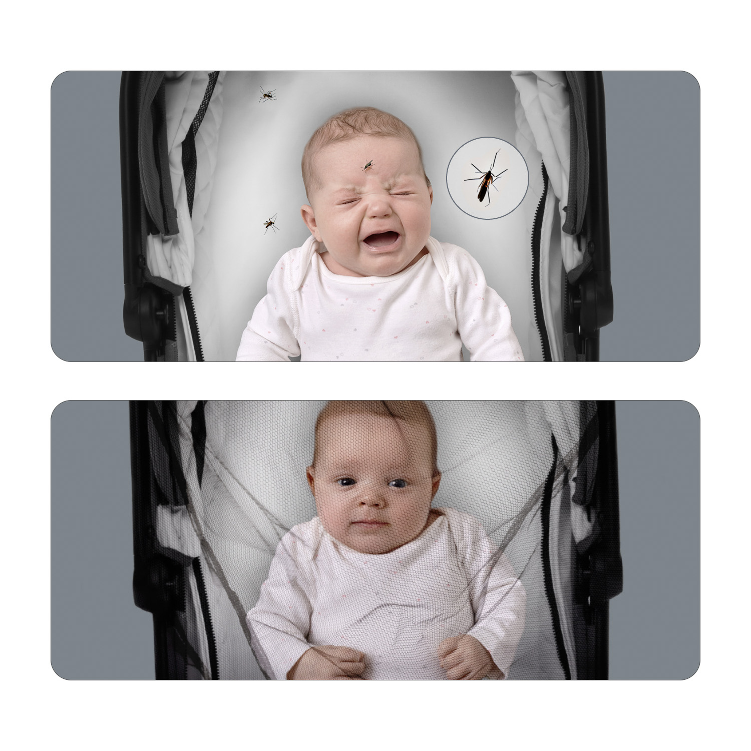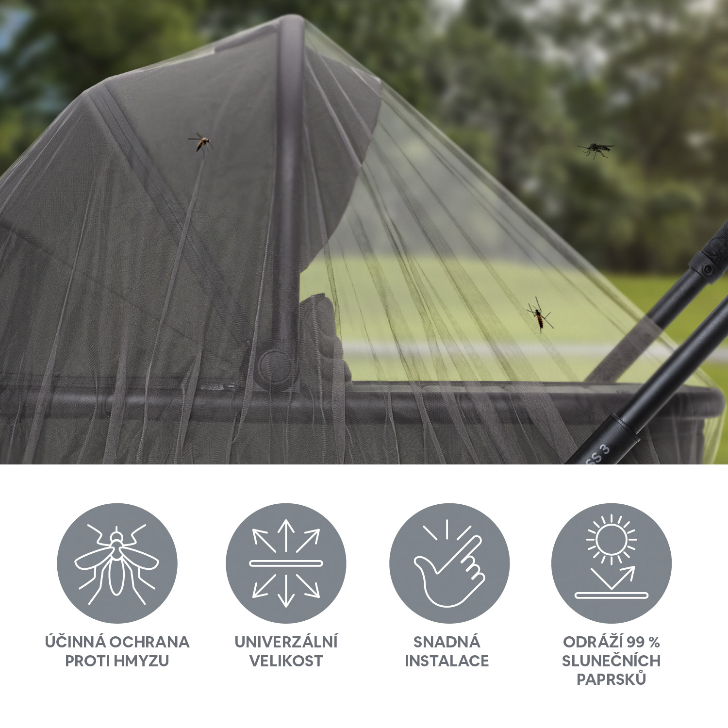 pomocou našej univerzálnej moskytiéry na kočík. Vďaka univerzálnej veľkosti je