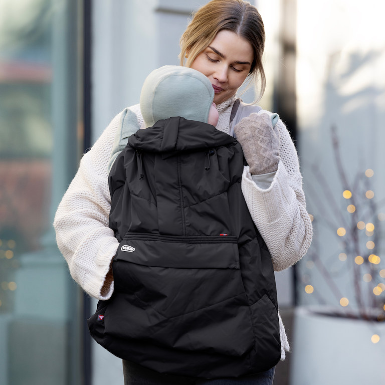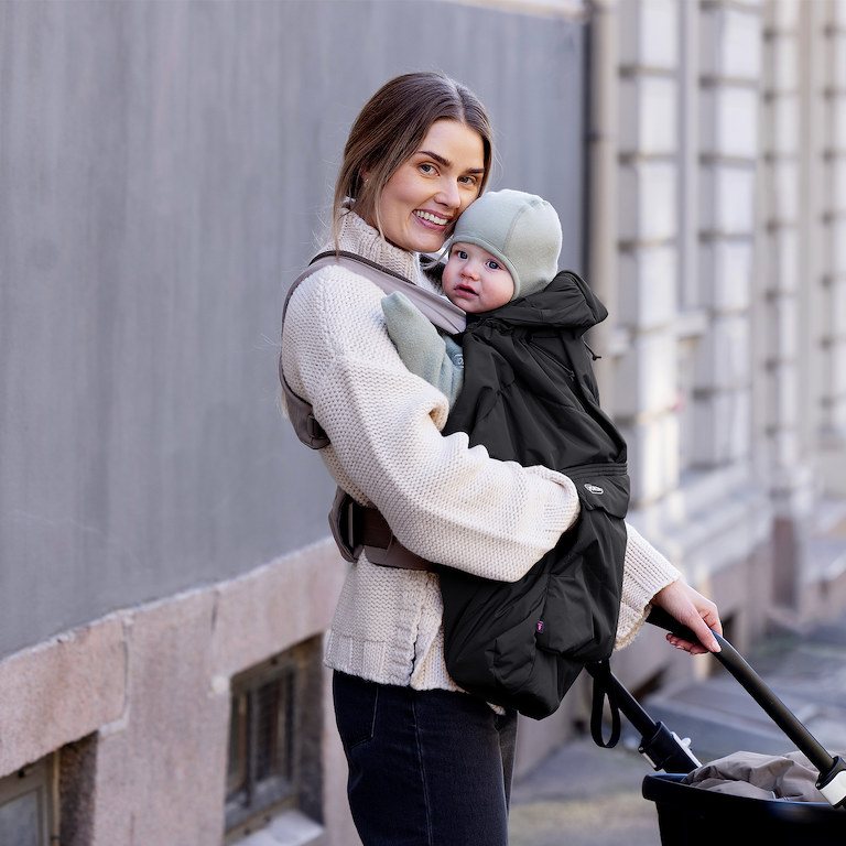 Poťah sa jednoducho pripája na akýkoľvek nosič pomocou patentných gombíkov. Zips v hornej časti umožňuje vetranie alebo rýchly prístup k dieťaťu. Kapucňu možno nastaviť tak, aby tesne priliehala k hlave dieťaťa, a vnútorné elastické šnúrky v oblasti nôh vám umožnia nastaviť ho podľa dĺžky vášho dieťaťa. Vrecká na ruky vám poskytujú priamy kontakt s dieťaťom alebo slúžia aj ako ohrev rúk. Keď sa kryt nepoužíva, dá sa zložiť do skladacieho vrecka na zips. Počas používania ponúka to isté vrecko pohodlné uloženie drobných osobných vecí. Kryt je určený na nosenie vnútri aj vonku a je perfektným praktickým pomocníkom aj v kočíku alebo pri dojčení vonku.